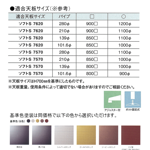商品名 テーブル脚 ソフトS7570 品番 YMT-STS7570-210STP ベース直径 570φ ※アジャスター付(6ヶ所) ベース高さ 14mm ※アジャスター高を除く パイプ 210φ 高さ 700mmまでのご希望サイズをご指定ください 受座 350x350mm(NO.106) 5.0mmt 木ネジ8ヶ穴 適合天板 角天板 850mm角まで / 丸天板 1000mmφまで ・天板サイズは高さ700mmを基準にしたものです。 ・天板重量やご使用条件によって適切でない場合があります。 パイプ材質仕上 スチール製 基準色塗装 ※色をお選びください ベース材質仕上 ステンレス製 サテン仕上げ 付属品 この商品に付属品はございません(※取付ビスは付属しておりません) 納期 通常3〜4営業日ほどで発送可能です 組立方式 ボルト固定式 ※商品到着後に組立作業がございます 返品・交換 こちらの商品は返品・交換が不可となります 備考 ■ボルト固定式 開梱後ベースとパイプをボルトで組み立ててご使用ください。 26(ミリ)サイズのレンチが必要です。 ※別売で26サイズ簡易ボックスレンチのご用意がございます。