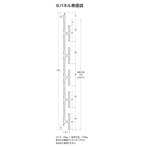 商品名 ウォールパネル F-type 5フェイスメインパネル WPD-F5M 1840mm シルバー 品番 WPD-F5M-18S 寸法 8.7mm x 159mm ※有効寸法 150mm (30mmピッチ x 5段) 長さ 1840mm 材質 アルミ 表面 アルマイトシルバー 注意事項 取付ビス ナベタッピング WPD-006 3.5x16mm WPD-008 3.5x20mm ステンレス ※パネルにビス穴は開いておりません 取付ピッチは200〜250mm 付属品 こちらの商品に付属品はございません 納期 通常1〜2営業日ほどで発送可能です 返品・交換 こちらの商品は返品・交換が不可となります 備考 ・別途有料にて切断加工も承っております ・安全にご使用いただくためには下地材の強度および取付ビスの長さ、数量、位置などを考慮して施工してください。