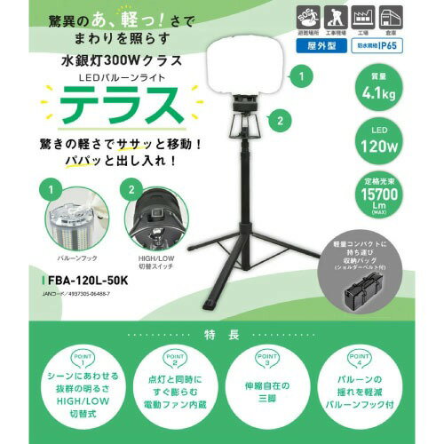 LEDバルーンライト テラス 高さ伸縮自在 [FBA-120L-50K] LEDライト ワークライト 作業ライト 収納バッグ付 防水 軽量 三脚 防災 避難場所 工場 倉庫 日動工業