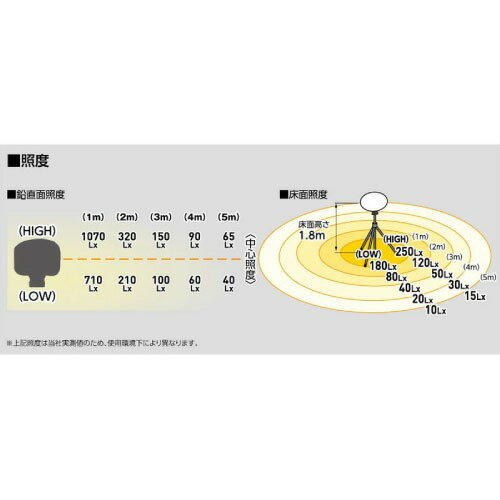 商品説明・驚異の明るさと軽量でまわりを照らすバルーンライト ・シーンにあわせてHIGHとLOWの切替ができる ・点灯と同時にすぐ膨らむ電動ファン内蔵 ・伸縮自在の三脚 ・バルーンの揺れを軽減するバルーンフック付き ・コンパクトに持ち運べる収納バッグ付き商品詳細□仕様 屋内・屋外兼用型(IP65) □定格電圧 AC100V(50/60Hz) □入力電圧範囲 AC90~110V □電線長 5m □入力プラグ ポッキンプラグ □スイッチ なし □消費電力 HIGH:120W LOW:80W □定格光束(Lm) HIGH:15700 □1m照度 垂直:915Lx 水平:1070Lx 光源高さ1.8mでの床面:250Lx □1/10ビーム角 360度 □光源色 昼白色(5000K) □使用環境温度 -15~40℃ □サイズ W832×D832×H1040~1934mm □質量 4.1kg □付属品 収納バッグ