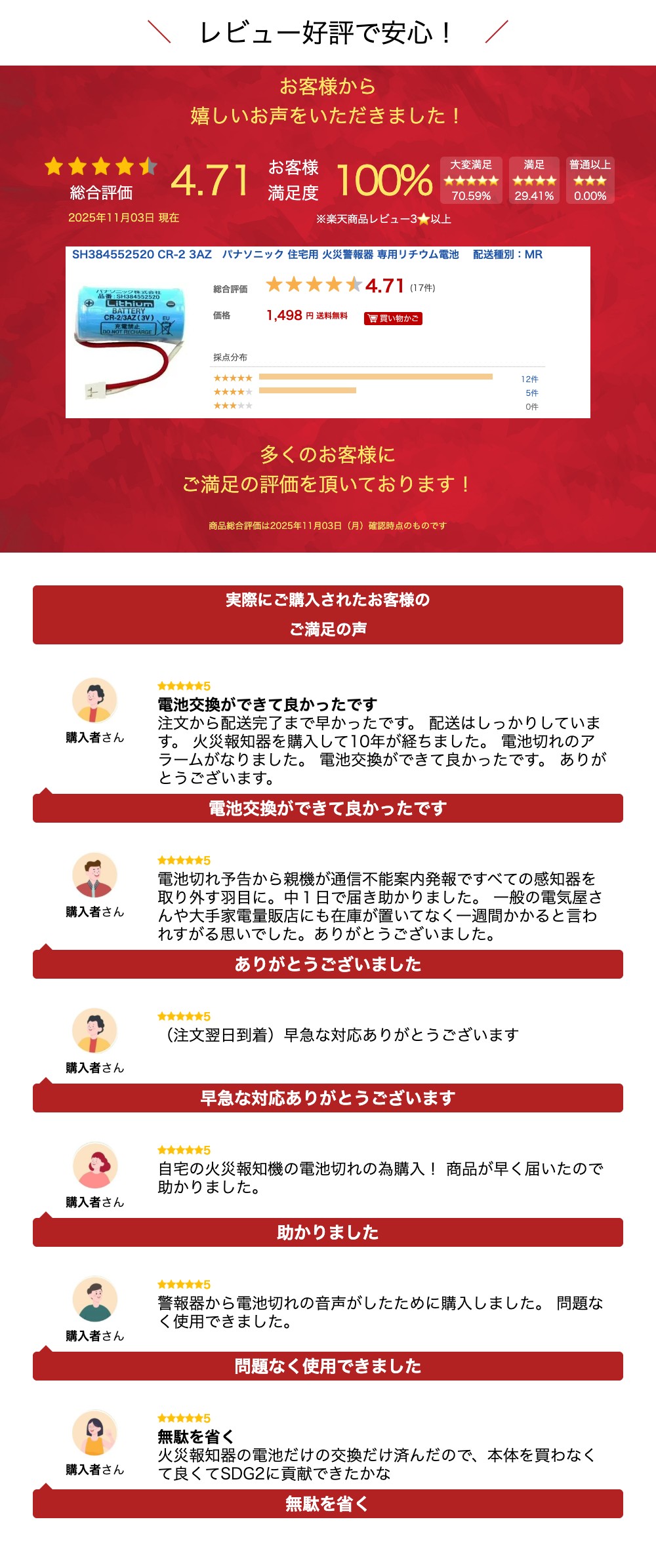 この商品は パナソニック 住宅用火災警報器専用リチウム電池 SH384552520 CR-2 3AZ 配送種別:MR ポイント 全国一律送料無料 商品紹介 お客様都合のキャンセル・返品に関しましては、メーカーお取り寄せ商品になりますので、ご注文後のお客様都合での返品・交換には応じかねます。クーリングオフでの適用は致しません。商品遅延による工事遅延損害は補償できません。写真は参考で、型番通り手配致します。何卒、ご了承のほど宜しくお願い致します。適応型番は多数ありますのでメーカーのHPにてご確認下さい。メーカー純正品商品番号:SH384552520、電池型番:CR-2/3AZ(3v)電設資材 けむり当番・ねつ当番 専用リチウム電池こちらの電池は充電式ではありません。ご購入の際は、お手元の電池型番と商品番号、コネクタ形状をよくご確認ください。 ショップからのメッセージ 納期について 2営業日以内に発送 4関連商品SH384552520 CR-2 3AZ パナソニック 住宅用火災警報...SH284552520 CR-AG/C25P パナソニック 住宅用火...パナソニック Panasonicソフトクローズ受け部材 ホワイト色 M...1,438円1,550円1,198円SH384552520【6個セット】【純正品】Panasonic 専用...【2個セット】パナソニック 住宅用火災警報器専用リチウム電池 SH38...SH384552520【3個セット】【純正品】Panasonic 専用...7,980円2,780円3,980円SH384552520【5個セット】【純正品】Panasonic 専用...SH384552520【4個セット】【純正品】Panasonic 専用...3個セット SH284552520 CR-AG/C25P パナソニッ...6,598円5,380円4,270円