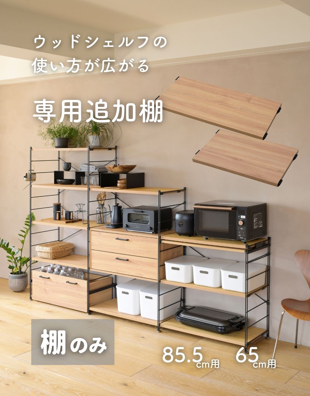 山善 YAMAZEN 棚板 ウッドシェルフ専用 【棚のみ】 MWS 幅85.5/65対応 本体サイズ 【幅85.5用】幅80×奥行37.5×高さ2.5cm 重量4kg【幅65用】幅59.5×奥行37.5×高さ2.5cm 重量3kg 材質 合成樹脂化粧繊維板(塩化ビニル樹脂)、スチール(粉体塗装) 仕様 ●原産国:中国●完成品です 商品説明 ●本体は重量もあるため、お二人以上での組み立てをおすすめいたいします。※本ページはオプションパーツ販売ページです。本体は別売りになります。※ラック本体の全体耐荷重は商品サイズにより異なるため、ラック本体よりご確認お願いします。※簡単設置構造のため、横揺れします。耐荷重には影響ございませんが、ご利用時に気になる場合は、『コの字補強バー』もご利用ください。※2024年12月3日より、幅85.5、65cmを本ページに統合します。●山善の「ウッドシェルフ」専用の追加棚板●2台のシェルフの間に連結して設置可能●木の質感があってお手入れも簡単な、合成樹脂化粧繊維板●耐荷重:1段あたり25kg●金属フックを取り付けた状態でのお届け 商品補足説明 YAMAZEN ヤマゼン 山善 通販 ナチュラルインテリア 北欧インテリア 韓国インテリア 海外インテリア シンプルインテリア カフェ風インテリア インダストリアルインテリア 一人暮らし 一人暮らし部屋 一人暮らし女子 二人暮らし 同棲準備 賃貸インテリア 賃貸暮らし マイホーム 家づくり 収納 収納アイテム 収納グッズ 便利グッズ 一人暮らしインテリア 一人暮らし部屋 収納術 収納見直し 模様替え 整理収納 すっきり暮らす 暮らしを整える ウッドシェルフ ラック シェルフ 棚 スチールラック 木製 木製棚板 ウッドラック スチールシェルフ 収納ラック オープンラック ディスプレイラック フリーラック テレビ台 見せる収納 飾り棚 リビング 洗面所 子供部屋 クローゼット 玄関 レンジ台 レンジボード キッチン カウンター キッチンラック パントリー QD932/AWH QD929/AIV QD931/OK QD930/ABRQV802/AWH QV770/AIV QV801/OK QV771/ABRウッドシェルフシリーズはこちら インテリア ランキング