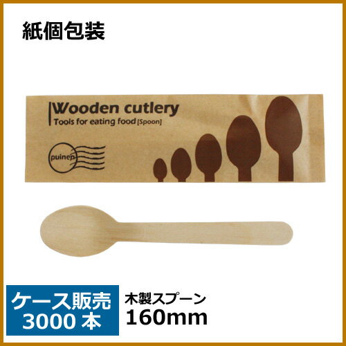 紙袋入 ウッド 木製 スプーン 160mm 業務用 3000本 /おしゃれで、かわいい 袋入りタイプ。テイクアウト用にも人気です。