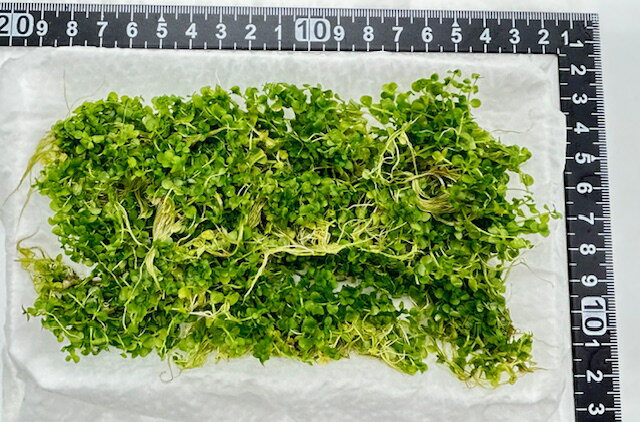 製品仕様 商品名 (水草) ニューラージパールグラス大量(15cm×9cm) 無農薬 無害虫 【水草セット 冬 栄養 アクアリウム 水槽 メダカ 熱帯魚】 サイズ/寸法 ニューラージパールグラス大量(15cm×9cm) ご注意事項 ・商品画像はイメージになります。・水草の状態によりサイズは写真と異なることがございます。・ポットの画像でもポットから外した状態で送らせていただくことがございます。・育成環境は一例です。この環境下で必ずしも綺麗に育つことを確約するものではございません。 育成難易度 簡単(初心者でも簡単) サイズ ニューラージパールグラス大量(15cm×9cm) 原産 南米 形態 有茎種 推奨水槽 30cm〜 光量(60cm水槽) 2〜3灯(40〜60W) 二酸化炭素(CO2)量(60cm水槽) 無くても可もしくは3秒1滴 水質 弱酸性〜中性、軟水〜弱硬水 PH(水素イオン指数) 5〜7 GH(全硬度) 0〜6 KH(炭酸硬度) 0〜6 温度 20〜28度 底砂 ソイル、砂 植栽位置 前景 生長速度 速い 増殖方法 差し戻し 肥料 底床固形+液体肥料 トリミング方法 差し戻しとは、長くなった部分を切り差し戻すことをいいます。茎の途中の節に根が出ている場合はその場所で切るのが1つの目安になります。切断する位置は茎の節の下から5〜7mmほどの所になります。切り取った上の部分を底床に植えて固定すれば、やがて根付きます。残った下部もまた同様に底床に植えて固定すれば、やがて脇芽を出して増やせます。ただし、下葉が影になって黄色くなったり枯れてしまっている場合は思い切って捨ててしまいましょう。側枝を作る場合も多く、側枝が水面まで伸びてきたら、また茎節の下5〜7mmの位置でカットして床砂に植えます。こうして簡単にどんどん増やすことができます。 店長のおすすめポイント ニューラージパールグラスは明るい緑色の葉のラージパールの種類です。通常のラージパールと異なりソイルなどを這うように増えていきます。別名「ミクランテムムsp」、「New ラージパールグラス」と呼ばれます。レイアウトでは 這う性質を利用して前景に用いるといいでしょう。当店のニューラージパールグラスはファーム産ですので安心してお使いいただけます。 ここに注意して育てましょう 新しい水をこのみますので水替えを多めに行いましょう。 注意 ・商品画像はイメージになります。・水草の状態によりサイズは写真と異なることがございます。・ポットの画像でもポットから外した状態で送らせていただくことがございます。・育成環境は一例です。この環境下で必ずしも綺麗に育つことを確約するものではございません。差し戻しで簡単に絨毯ができる! 差し戻しという増殖方法は、長くなった部分を切り差し戻すことをいいます。ニューラージパールグラスは明るい緑色の葉のラージパールの種類です。通常のラージパールと異なりソイルなどを這うように増えていきます。当店のニューラージパールグラスはファーム産ですので安心してお使いいただけます。