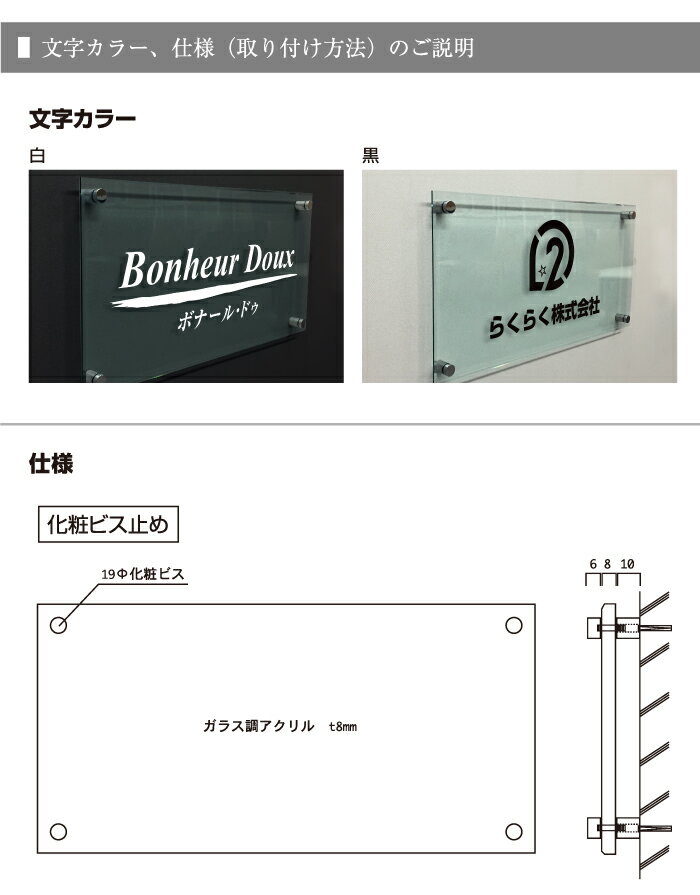 材 質 ガラス調アクリル サイズ H300×W600×t8mm 加 工 カッティングシート加工(白:外貼り 黒:内貼り) 同梱内容 施工・お手入れ方法説明書・取り付け用部材 データ入稿 → こちらをご確認ください材 質 ガラス調アクリル サイズ H300×W600×t8mm 文字加工 文字:カッティングシート加工(白:外貼り 黒:内貼り) 納 期 デザイン確定後、約1週間 ※お届け地域により前後する場合がございます。 事務所や会社の開設でお急ぎの方! 短納期でも対応します!お気軽にご相談ください。 同梱内容 施工方法・お手入れ方法説明書・取り付け用ボルト ガラス調アクリルについて ガラス調アクリルは、ガラスのように見えるプラスチック樹脂板の8mm厚の板になります。軽い・錆びない・腐らないというプラスチックの特徴に加え、強度はガラスの約10倍 という特性があります。※万が一割れた場合でも飛び散る心配もありません。 データ入稿 → こちらをご確認ください ご注意 汚れた場合は水洗いしてやわらかな布で優しく拭き取ってください。 強くこすったりシンナーやアルコール等の溶剤を使用しないでください。 当商品につきましてはデザインの無料提案は不可となります。ご注文後のデザイン作成となります。 サイズ変更での製作も可能ですが別途お見積もりとなります。