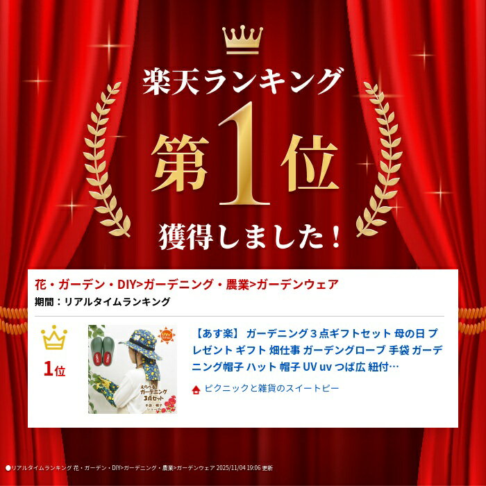 ※ラッピングについて、詳しくはこちら ▼商品名▼ ガーデニング3点セット ▼商品説明▼ 母の日やガーデニングが趣味の大切な方にオススメ! ガーデンシューズ、UVケア帽子、ロングUV手袋の3点ギフトセット 【ガーデンシューズ】 とっても軽くて履きやすいスリッポンタイプのサンダルです。 お買い物やお散歩などのちょっとした外出や洗濯物干し、 ベランダ履きや玄関用のサンダルにもぴったりです。 かかとがないので脱ぎ履きも楽チン♪ 水に濡れてもしみこまないEVA素材だから、草木の水やりや お庭いじりのガーデンシューズとしても活躍してくれます。 【帽子】 紫外線対策におすすめの日よけ付きサファリハット。 UVカット加工を施しているのでガーデニングや農作業、草取り、 洗濯物干しなど様々なシーンで活躍! あご紐付きで風の強い日も安心。 あご紐と背面の日よけフラップは取り外し可能です。 【ガーデングローブ】 肘まで届く長さで紫外線対策におすすめのUV手袋。 ガーデニングや農作業、草取り、洗濯物干しなど様々なシーンで活躍! 滑り止め加工もしてあるので安全です。 母の日や敬老の日、お誕生日のギフトにもおすすめです。 日頃の感謝を込めてプレゼントしてくださいね♪ ※ご注意 素材感や色合いの表現には環境により異なる場合があります。 予めご了承ください。★選べるギフト!ガーデニング3点セット★素敵なガーデニングの時間をかわいい雑貨でもっと楽しく♪ (ガーデンシューズ)詳細は こちら (帽子)詳細は こちら (ガーデングローブ)詳細は こちら ・Spec 商品名 ガーデニング3点ギフトセット セット内容 【ガーデンシューズ】 37:23.5cm(甲幅約9.5cm×長さ約24.5cm) 38:24.0cm(甲幅約10cm×長さ約25.5cm) 42:26.5cm(甲幅約10.5cm×長さ約27.5cm) 素材:EVA 【帽子】 つば長さ:約8.5cm 深さ:約9cm 頭周り:約57cm ネックカバー:約24cm 素材(08〜26):本体/綿65%・ポリエステル35% ひさし内部/ポリエステル 素材(27〜29):ポリエステル100% 【ガーデングローブ】 フリーサイズ(長さ約47cm×幅約10cm) 素材(オリーブBL・レモンNV・フラワーBL):本体/綿100% 滑り止め/PVC 素材(ミモザ・ローズ・アジサイPK):本体/ポリエステル80%・綿20% 滑り止め/PVC 詳しくはこちら