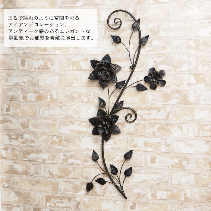※ラッピングについて、詳しくはこちら ▼商品名▼ フラワーウォールデコ ▼品番▼ 6265 4934006062655 ▼商品説明▼ 立体的な花のモチーフが素敵なアイアン製ウォール デコレーションです。 枝の曲線や葉が本当に壁をつたっているかのようで素敵です。 ブラックに少しゴールドがかかった擦れた色合いが アンティーク感を醸し出しています。 まるで絵画のように空間を彩るアイアンデコレーションは 部屋の壁や廊下に飾ったり、ガーデンオーナメントとしても おすすめです。 ※ご注意 素材感や色合いの表現には環境により異なる場合があります。 予めご了承ください。★ フラワーウォールデコ ★ まるで絵画のように空間を彩るアイアンデコレーション ・Spec 商品名 フラワーウォールデコ 素材 アイアン サイズ w約30cm×d約3.5cm×h約78cm 重さ:約540g ※多少の個体差がございます。また、当店実寸サイズのためメーカー表記と異なる 場合がございます。 備考 取り付け用のビス等は付属しません。 掲載写真はサンプル品です。花びらや葉の数、位置、隙間、歪み、塗装、サビ感のムラなど、 実際にお届けの商品とは個体差がございます。 仕上げの特徴や個体差が理由での返品交換は承ることができませんので予めご了承ください。 詳しくはこちら
