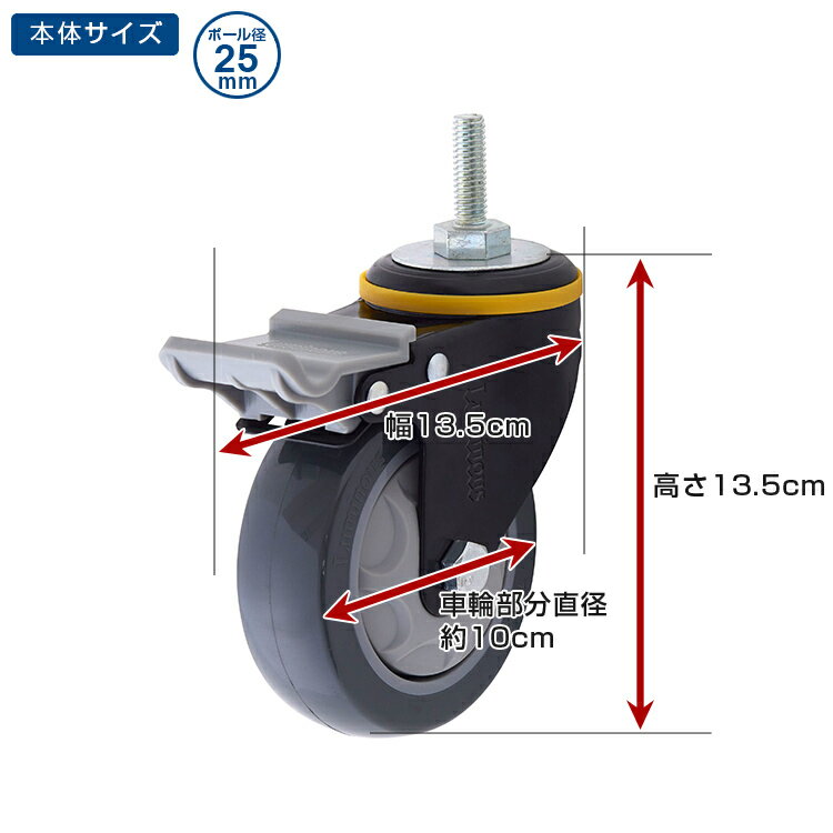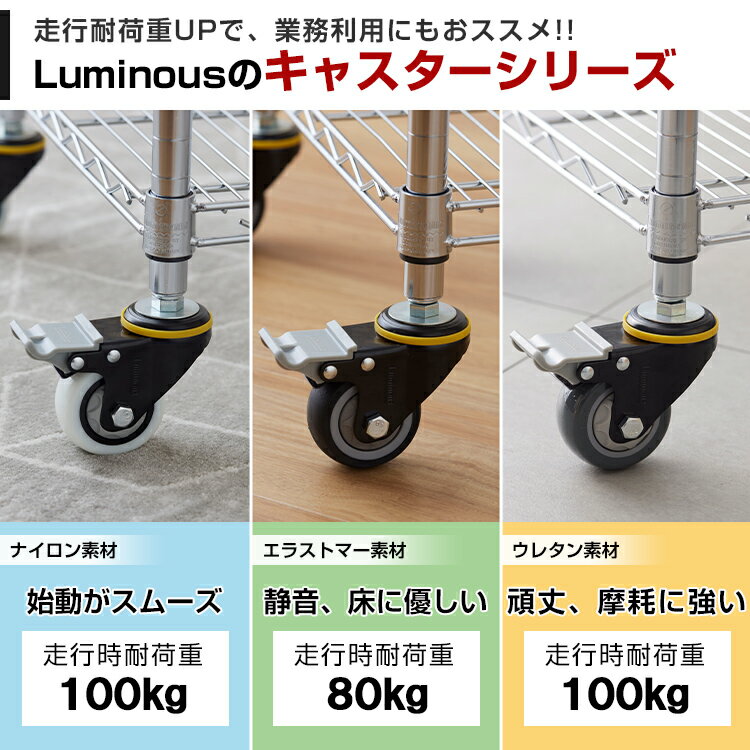 高耐荷重キャスター 4個セット ウレタン 業務用キャスター ラック スチールラック パーツ ポール径25mm 足パーツ 脚パーツ 車輪 スチール メタル ラック ワイヤー スチールシェルフ ルミナス 純正品 高さ13.5cm ストッパー付 ゴム l100us-gyn-4