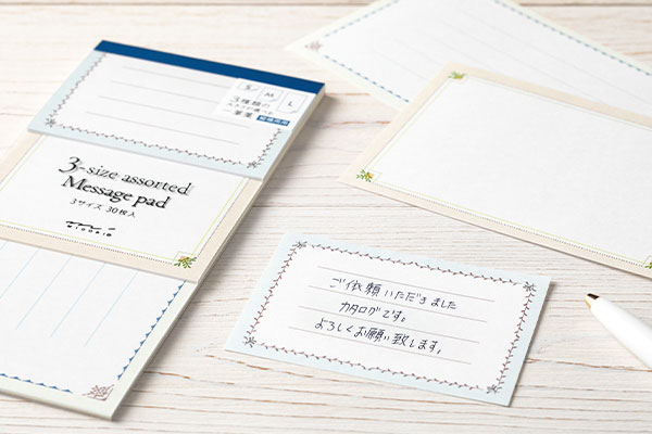 商品名 ミドリ 一筆箋 3サイズ 飾り罫柄(89516006)【MIDORI レター かわいい デザイン おしゃれ】 メーカー国 日本 メーカー名 ミドリ / MIDORI 仕様 ■本体サイズ:高さ177mm×横幅84mm×厚さ5mm ■30枚入(3サイズ×10枚) ■Sサイズ:高さ60mm×横幅84mm 縦横両用3行罫 ■Mサイズ:高さ115mm×横幅84mm 無罫 ■Lサイズ:高さ177mm×横幅84mm 縦横両用4行罫 備考 ●用途や文章量に合わせて、3サイズの大きさが選べる一筆箋です。 ●お仕事などで郵送物や資料にちょっとしたひとことを添えたいときや、気軽な贈り物にメッセージを書きたいときなどにおすすめのアイテムです。輸入・デザイン文具 用途や文章量に合わせて、3種類の大きさが選べる一筆箋 用途や文章量に合わせて、3サイズの大きさが選べる一筆箋です。お仕事などで郵送物や資料にちょっとしたひとことを添えたいときや、気軽な贈り物にメッセージを書きたいときなどにおすすめのアイテムです。 3種類の一筆箋が一冊に綴じられているので、かさばらず持ち運びにもとても便利です。紙は通常の一筆箋に比べ少し厚めの用紙を使用しているので、一番小さいSサイズでもきちんとした印象を与えてくれます。 シンプルで落ち着いたデザインの飾り罫柄は、男女ともに使いやすいデザインなので、ビジネスシーンでも活躍してくれます。3サイズともに、縦にも横にも書くことができるので、様々な場面に合わせてお使いいただけます。 ↓↓↓ミドリ 一筆箋 3サイズのシリーズは↓↓↓↓↓↓こちらのリンクからどうぞ↓↓↓ 【飾り罫柄】 【飾り罫柄】【89516006】はこちら!! 【花束柄】 【花束柄】【89517006】はこちら!! 【ボタニカル柄】 【ボタニカル柄】【89518006】はこちら!! 【カラーブロック柄】 【カラーブロック柄】【89519006】はこちら!! ↑↑↑"ミドリ"の全商品ラインナップは↑↑↑↑↑↑こちらのリンクをクリック!!↑↑↑ ※"ミドリ"の全商品ラインナップはコチラのリンクからご覧いただけます。ミドリ製品の特集ページへ移動します!
