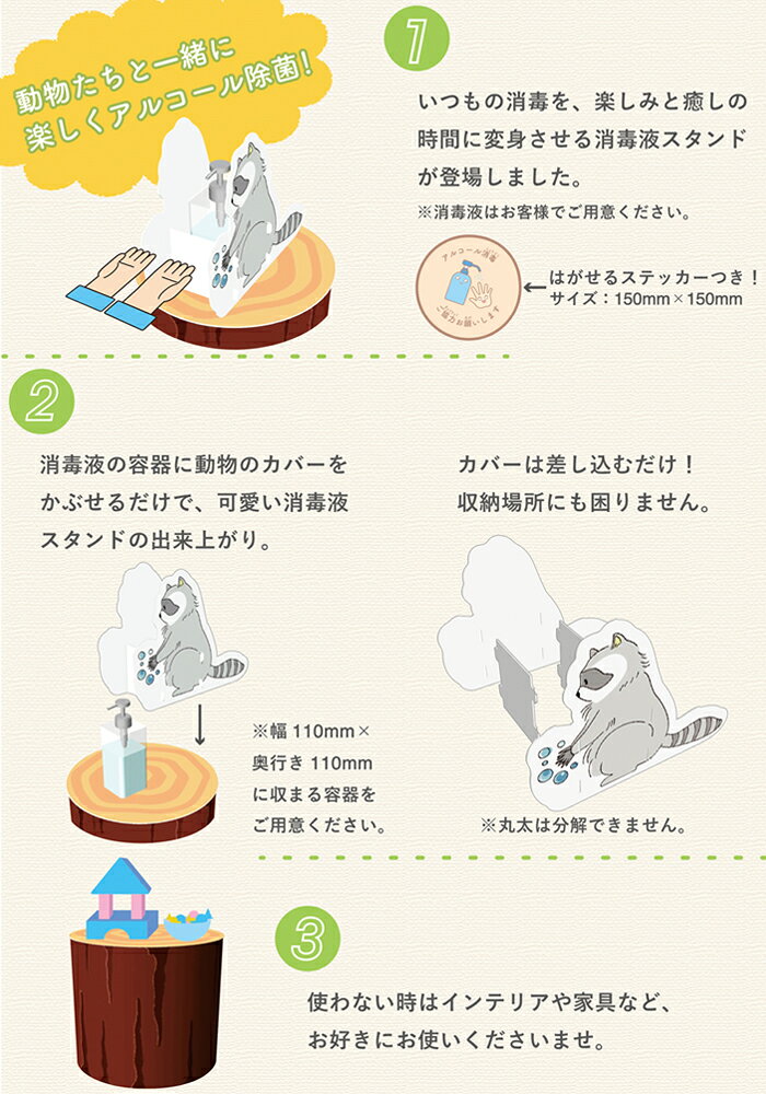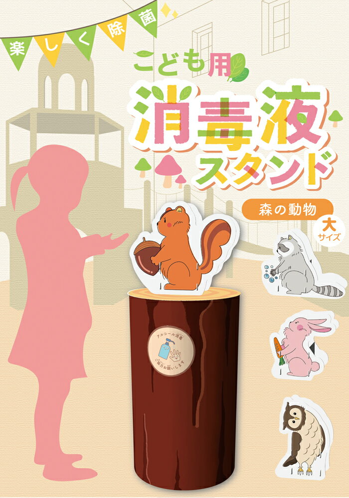 Information 商品名 日本製 子供用 消毒液スタンド 森の動物 大 サイズ 【アライグマ】 カバーパネルサイズ:346×130×270mm 丸太サイズ:350×350×600mm 重量:2.17kg 【ウサギ】 カバーパネルサイズ:260×130×270mm 丸太サイズ:350×350×600mm 重量:2.16kg 【フクロウ】 カバーパネルサイズ:117×130×324mm 丸太サイズ:350×350×600mm 重量:2.16kg 【リス】 カバーパネルサイズ:317×130×271mm 丸太サイズ:350×350×600mm 重量:2.18kg 素材 丸太:Re-board ボトルカバー:カッツボード 日本製 ご返品・ご交換について ※衛生用品のため、お届け後の返品交換はご遠慮くださいませ。 ■ご注意 ※紙素材で出来ています。お取り扱いにはご注意ください。 ※水の掛かる場所、濡れている床面、火元の近くでのご使用はお控えください。 ※本品にアルコール消毒液などは含まれておりません。別途ご用意ください。 ※広くひらいた場所で組立作業を行い、床面には突起物や硬いものが落ちていないか確認してください。 ※組立の際は各パーツの表・裏、取り付け向きに注意してください。