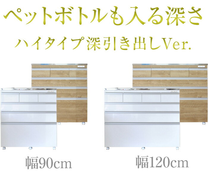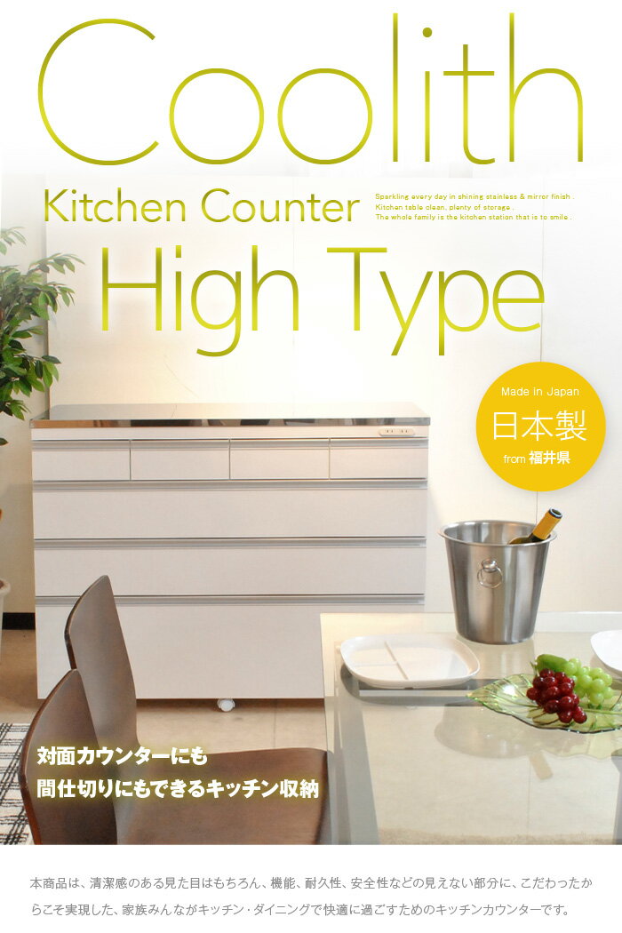 ステンレス天板の薄型キッチンカウンター、ハイタイプ深引き出し シンプルで使いやすいが評判のキッチンカウンターに高さ100cmタイプのキッチンカウンターがお客様の要望により登場。耐荷重が高くなり、たっぷり収納できるキッチン収納です。最下段にはペットボトルが入る高さになっております。●サイズ:幅90.2×奥行き43.6×高さ100.2cm内寸・1段目:幅21.5×奥行23.5×高7.5(有効高10)cm ・2段目:幅81.2×奥行33.5×高7.5(有効高11)cm ・3段目:幅81.2×奥行33.5×高7.5(有効高12)cm ・4段目:幅81.2×奥行33.5×高13.5(有効高33)cm *( )は 側板上部までの高さ●主な材質: 天板:ステンレス、前板:鏡面ポリエステル化粧板、側板ポリエステル化粧板 ●カラー:ホワイト(白)、木目ブラウン●仕様:完成家具(キャスターのみお客様取り付け)●製造国:日本製、国産●商品重量:約45kg●コード長さ:背面から出る長さは約150cmです。(コード自体は約200cm)●備考:1500W2ヶ穴コンセント付、前面2個のキャスターストッパー付、キャスター付。2〜4段目:フルスライドレール。●耐荷重:1段目:5kg、2〜4段目:20kg<キャスター無しでのご使用はご遠慮ください> 本商品は、キャスター付きでのご使用を想定して設計されております。 あらかじめ本体底面にはキャスターを設置するための金具が取り付けられており、 キャスターを外してご使用いただくと、床などに金具による深い傷が残る可能性がございます。 また本体の歪みや破損に繋がる恐れもございますため、 必ず、キャスターを設置してご使用くださいますよう、お願い申し上げます。 <お届け時のキャスターのお取り付けについて> キャスターの取り付けは、配送員がボルトを手で締められるところまで行います。 納品完了後に必ず、お客様ご自身で、付属の工具(スパナ)で強く締めてください。 有料オプションで、配送員による締め上げもご指定いただけますので、 作業に不安がある方や、工具(スパナ)を使ったことがない方はお選びください。 ※付属の工具(スパナ)で締める作業にはある程度の力が必要です。 ※締め上げを行わない場合、キャスター部分に不具合が生じる可能性がございます。 物品・周囲の破損や、お怪我に繋がりますので、キッチンカウンターに物を設置・収納する前に必ず強く締めてください。 ※ご注文者様とお受取り人様が異なる場合、上記注意事項について、ご注文者様からお受取り人様へご案内をお願い致します。