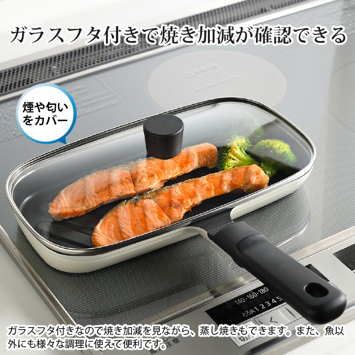 【北海道・沖縄・離島配送不可】■商品説明コンパクトサイズでも本格的な魚焼き今までにないコンパクトサイズでも様々な熱源に対応している本格的な魚焼き。1~2人前を手軽に焼くことができます。・様々な熱源に対応(IH(100V、200V)、ガス、シーズヒーター、電気プレート、ハロゲンヒーター)・ガラスフタ付きなので焼き加減を見ながら、蒸し焼きもできます。また、魚以外にも様々な調理に使えて便利です。・波形プレートなので余分な脂が落ちてヘルシーです。脂は焼き面の凸部のゆるい傾斜で余分な脂を落とし、凹部の傾斜で斜め奥側へ流れていきます。・凸部の幅が広い波形プレートなので綺麗な焼き目をつけてくれます。・内面はこびりつきにくいダイヤモンドフッ素コート(PFOA/PFOS不使用)。・丸洗いできてお手入れ簡単。コンパクトで軽いアルミ製です。■サイズ幅27cm×奥行31cm×高さ8cm(フタ含む)焼き面寸法:幅25cm×奥行11cm■素材本体:アルミニウム合金(内面/ふっ素樹脂塗膜加工、底面/鉄溶射加工)(底厚最大8.5mm)本体ハンドル:フェノール樹脂(耐熱温度140度)フタ:全面物理強化ガラス、ステンレス鋼(クロム17%、ニッケル5%)フタつまみ:フェノール樹脂(耐熱温度140度)■重量:約1.2kg■カラー:ホワイト■原産国:韓国■商品状態:完成品■備考・ガス、IH:使用可能※海外製IHクッキングヒーターでは使用できない機種もございます。・食器洗い乾燥機:不可■ご注意※掲載の写真はお使いのモニターやPCの環境によって違って見える場合がございます。※商品のイメージ違いによる、ご返品・交換は原則としてお断りしておりますので、予めご了承ください。※配送できず返品となった場合「往復の送料」「再梱包費用」をご請求させて頂きます。【レビューキャンペーン商品202306】※現在ご覧のこちらのページからは、【コンパクトおさかなロースター】がご購入いただけます。 コンパクトおさかなロースター スチームクッカー