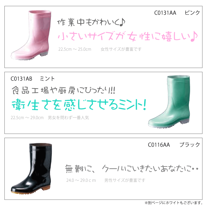 ※詳しくは当店ページ最下部のショッピングガイドをお確かめ下さい。 【弘進ゴム】ゾナ ZONA G3耐油 カラー 素材 特殊配合ビニル カラー C0131AA:ピンク(22.5〜25.0cmまで有) C0131AB:ミント C0116AA:ブラック(24.0〜29.0cmまで有) サイズ 22.5 23.0 23.5 24.0 24.5 25.0 25.5 26.0 26.5 27.0 28.0 29.0 ※29.0cmは価格アップ 詳細 外寸:30.0cm(26.0cmの場合) 抗菌防カビ剤配合 特徴 衛生長靴の超ロングセラー食品工場から厨房まで幅広く愛用されています HACCP対応の厨房用長靴 ゾナG3耐油 食品工場から厨房まで、幅広い分野から愛用されています。 ◇抗菌性能 病原性大腸菌や黄色ブドウ球菌等の食中毒の原因となる細菌類やカビ類の発生・増殖を抑制。 抗菌・防カビのダブル効果により防臭効果にも優れています。 ◇安全性 ゾナに使用されている抗菌剤は2成分の混合で、抗菌製品技術協議会で定めた以下の試験方法で合格したものを使用しています。 使用量も、安全性試験の結果を元に上限を決めています。 注意 ※商品画像について、パソコン環境により多少の色誤差が生じますことを予めご容赦ください。ZONA G3耐油 ZONA G3耐油 カラー ZONA G3耐油 カバー付 ▼ その他のサイズはこちら ▼ 22.5-28cm 29cm