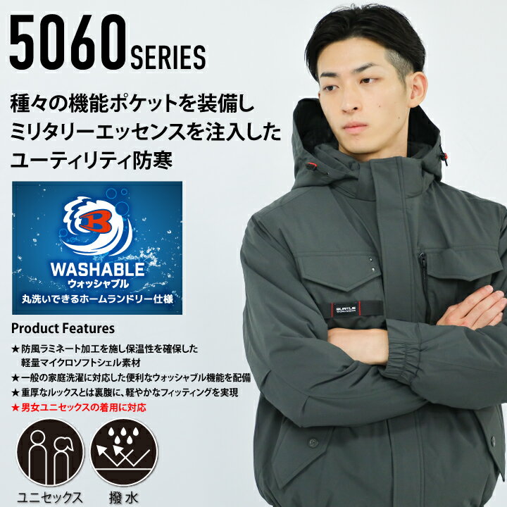 【当日発送】バートル 5060 防寒ブルゾン 防寒着 長袖 2025 新作 新商品 ウォッシャブル 洗える 防風 保温 撥水 秋 冬 フード付き 取り外し可能 メンズ レディース ミリタリー BURTLE