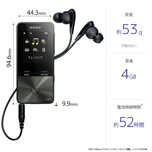 ソニー NW-S313-B ウォークマン Sシリーズ[メモリータイプ] 4GB ブラックソニー ポータブルオーディオ(メモリー) WALKMAN NW-S313 B 色名称 ブラック商品名称 ウォークマンSシリーズ[メモリータイプ]WALKMAN発売年月日 2017年09月09日本体寸法:94.6mm*44.3mm*9.9mm(53g)高さ*幅*奥行き(質量)・家でも外でも、大好きな音楽をいい音で手軽に楽しめる・コンパクトボディでスタミナたっぷり長時間バッテリー・語学学習を快適にサポート家でも外でも、大好きな音楽をいい音で手軽に楽しめるSシリーズなら、どこでも手軽にいい音で音楽を楽しめます。例えば外出先の電車の中。周囲の騒音をカットする「デジタルノイズキャンセリング機能」(*1)により、周りの騒音を気にすることなく大好きな音楽に浸ることができます。ほかにも、音源に合わせて音質を選べる多彩なイコライザーモードの搭載や、FLAC(*2)など高音質コーデックにも対応。かんたんな操作で高音質な音楽を楽しめます。*1 本体に付属のヘッドホンまたは別売のノイズキャンセリング機能搭載ウォークマン専用ヘッドホン(MDR-NWNC33)を使っているときにのみ有効です。周囲の騒音がまったく聞こえなくなるわけではありません*2 サンプリング周波数:8-48kHz、量子化ビット数:16bitに対応コンパクトボディでスタミナたっぷり長時間バッテリー約53g(*1)のスリムボディでありながら、音楽再生約52時間(*2)のロングバッテリー。長時間の外出でも電池切れを気にせずにたっぷり音楽を楽しむことができます。*1 本体のみの質量。充電池含む*2 内蔵充電池使用、MP3 128kbpsモード時、デジタルノイズキャンセリング機能およびイコライザーOFF時。設定条件により異なります語学学習を快適にサポート毎日の通学・通勤時や自宅での語学学習を便利にサポート。集中して学習したい箇所を繰り返し聴ける「A-Bリピート再生」や、再生位置を戻す「クイックリプレイ」など、効果的な機能を搭載しています。 主な仕様画面サイズ1.77インチラジオ有標準実装メモリー容量4GB連続再生時間52時間バッテリー種類リチウムイオンUSB接続対応有ダイレクトエンコーダー機能有主な付属品ヘッドホン(1)MDR−NC31(ノイズキャンセリング機能対応ヘッドホン)、イヤーピース(各サイズ2個1組)、USBケーブル(1)、WM−PORTキャップ(1) (*)、取扱説明書(1)、ウォークマンに音楽を転送/録音する(1)、使用上のご注意/主な仕様(1)、保証書(1)、製品登録のお願い(1)Bluetooth有対応OSWindows(R) 10、Windows(R) 8.1、Windows(R) 7、Mac OS(TM) v10.8−10.12ビットレート別記録時間●MP3 128kbps 約830曲●AAC 256kbps 約410曲●FLAC 44.1kHz/16bit 約75曲 ※ 1曲4分換算 曲数は目安ですボイス録音×