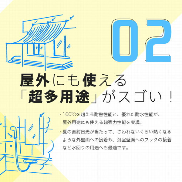 特長・接着層がショックを吸収。ハガレにくい弾性接着剤・屋外にも使え、-40℃〜120℃に適応 ※水没する用途はNG・凹凸面にもOK 溶剤を使用しないので肉やせしない・垂直面にOK タレが少なく、軽いものなら仮止め不要 ※表札などは仮止めをする・クリーン いやなニオイも少ない、あんしん無溶剤タイプ接着できるもの金属:ステンレス、アルミ、銅、鉄 等プラスチック:ナイロン、スチロール、アクリル、塩化ビニル、ABS、FRP、ポリカーボネート、各種エンジニアプラスチック等ゴム:天然ゴム、合成ゴム、シリコーンゴム ※1、EPDM等無機材料:コンクリート、モルタル、天然石、タイル、ガラス、陶磁器等天然素材:木材、合板、皮革、布、厚紙等※1 シリコーンゴムは接着性に差がありますのでご確認の上、ご使用ください※貴金属や高価格品の接着には使用しないでください。※皮ふや飲食物が直接触れる部分の接着・補修には使用しないでください。※接着面が小さい部分(眼鏡フレームなど)には充分な接着力が得られません。※生物を入れる容器には使用できません。接着できないものポリエチレン、ポリプロピレン、フッ素樹脂、ポリアセタール等用途表札やプレートの接着塩ビレザーへのプラスチック小物の接着ゴムと繊維の接着発泡スチロールと軟質塩ビシートの接着アクセサリー製作コンクリート面へのステンレスの接着バッグや靴の補修使い方1.接着する面のゴミ・サビ・油などの汚れをサンドペーパーやアルコールなどで落としてよく乾燥させます。ゴムや皮革は必ずサンドペーパーをよくかけてください。2.添付のヘラの薄塗面を使用し、接着する両面に薄く均等に塗布します3.約5〜10分放置します。4.粘着テープのような粘着性がでてきたらすぐに貼り合わせ、強く押さえます。必要に応じて粘着テープやヒモなどで固定します。10cm角以下の「小さい面積」または「湿気を通すもの」には片面塗りが可能です。※約1〜2時間で動かなくなり、約24〜48時間で実用強度に達します。※放置時間を取りすぎて接着できなくなった場合は再度上から塗布して最初からやり直してください。※はみ出し部は硬化前ならラッカー薄め液でふき取れますが、下地を侵すなど異常がないかどうか充分確認してください。硬化後はカッターなどで切り取った方がきれいに仕上がります。この場合ケガをしないように注意してください。注意事項火気のあるところでは使用しない。使用時及び使用後しばらくは換気をよくする。子供の手の届かないところに置き、いたずらをしないよう注意する。接着用途以外に使用しない。衣服につくととれないので注意する。直射日光の当たらない涼しい場所に保管する。キャップ先端が尖っているのでけがをしないように注意する。中身を使い切ってから自治体の定める方法により燃えないゴミとして捨てる。応急処置皮ふについた場合はすぐにふき取り、石けんでよく洗い流してください。使用時に気分が悪くなるなどの異常を感じた場合は、すぐに空気の新鮮な場所に移動し、必要に応じて医師の診察を受けてください。目に入った場合はこすらずに多量の水で洗眼し直ちに医師の診察を受けてください。飲み込んだ場合は、すぐに口の中を洗い、直ちに医師の診察を受けてください。かゆみや炎症などの症状が出た場合は、すぐに使用をやめ医師の診察を受けてください。