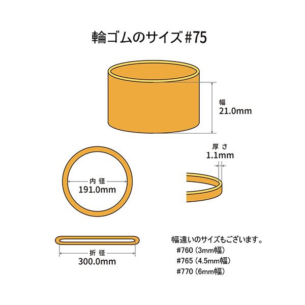 レビュー投稿で次回使える2000円クーポン全員にプレゼント■商品内容【ご注意事項】この商品は下記内容×2セットでお届けします。結束、包装、縫製などに広範囲に利用でき、作業性、経済性に優れています。●番手#75のゴムバンド、気軽に使用しやすい少量包装・50g。●少量なので、家庭用やオフィス事務用品、サイズお試し用(試作用)などに。●良質の天然ゴムを使用し、菓子のアメに似た色をしているところから、「アメバンド」もしくは「アメ配合」と呼ばれています。■商品スペックサイズ:#75色:アメ内容量:50g切り幅:21mm内径:191mm折径:300mm厚さ:1.1mm材質:天然ゴムその他仕様:●参考平均本数:4本●推奨結束径:660〜1070mm(1重巻きを想定した参考値)シリーズ名:オーバンド■送料・配送についての注意事項●本商品の出荷目安は【5 - 11営業日 ※土日・祝除く】となります。●お取り寄せ商品のため、稀にご注文入れ違い等により欠品・遅延となる場合がございます。●本商品は仕入元より配送となるため、沖縄・離島への配送はできません。