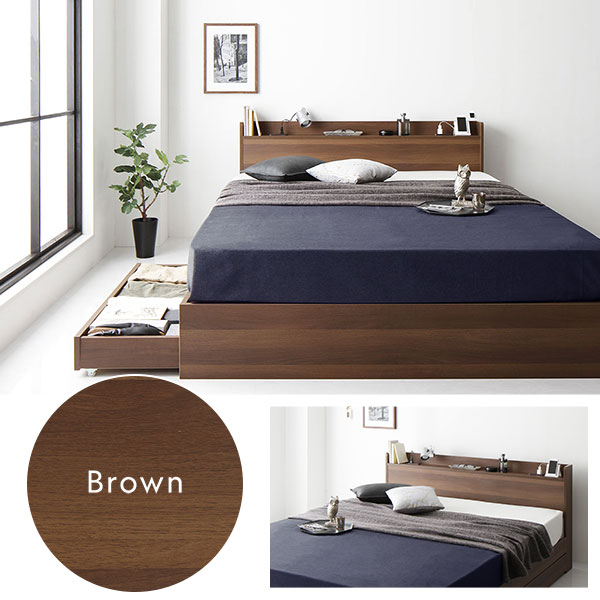 【送料無料】ベッド ダブル 3ゾーンポケットコイルマットレス付 ヴィンテージブラウン 収納付き 宮付き
