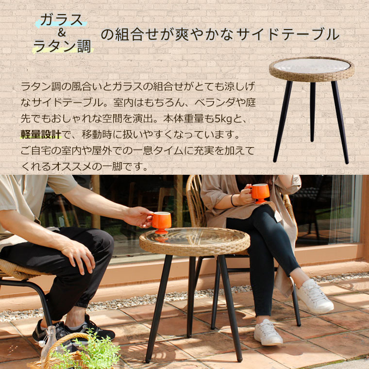 下記地域は、追加送料が発生いたします。 北海道・東北・沖縄・離島 ※東北地方へのお届けは一部送料無料商品もございます。 詳しくは送料料金表をご確認下さいませ。 サイズ 幅50×奥行50×高さ55cm 重量:5kg 材質 天板:PE ポリエチレン(ラタン調)/強化5mmクリアガラス 脚部:スチール(粉体塗装) 特徴 組立品 ※ガラス受けのクッション無し 説明 室内でも屋外でも使える、ラタン調の柔らかい風合いとガラスの透明感がおしゃれなサイドテーブル。室内での使用はもちろん、ベランダやウッドデッキで気持ちの良い風に吹かれながらのくつろぎタイムにもオススメ。 購入前の注意事項 欠品・完売の場合は、その旨ご連絡させていただきます。 写真と実際の色が異なって見える場合がございます。 恐れ入りますがあらかじめご了承下さい。シリーズアイテム