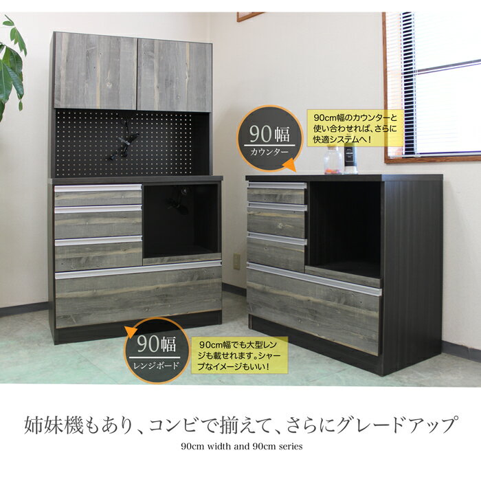 キッチンカウンター レンジ台 キッチン収納 家電収納 90幅 90cm 完成品 日本製 木目調 木製 モダン ヴィンテージ シンプル かっこいい 台所収納 スライド棚 棚 引出 引出し収納 4杯 ブラウン デニム90カウンター