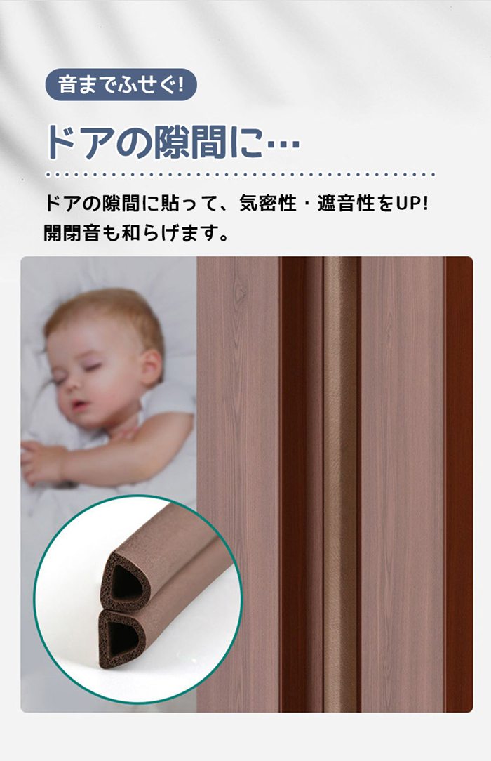 品番:jxhb01 カラー:ブラウン、ブラック、ホワイト、グレー サイズ:厚さ6mm/幅9mm/長さ6m 素材:EPDM 商品説明: 裏面のテープを剥がして貼るだけ 簡単なDIYで以下の効果が期待出来ます。 【防音効果】 ドアの隙間を埋めることで 閉まるドアの衝撃をソフトに吸着して 衝撃音を吸収します。 【気密性アップ】 隙間にピッタリと馴染む適度な弾力性があり 小虫、蚊などの害虫や埃の侵入を軽減します 【省エネ効果アップ】 気密性が上がるので冷暖房効率も上昇 省エネ効果も期待できます。 ご注意: ※撮影の為、画質等の関係上、色などが実際の商品と若干違ってしまうこともあるかもしれませんがご理解のほどご入札ください。予めご了承ください。 ※製造時期によりデザインや仕様に若干の変更がある場合がございます。予めご了承ください。