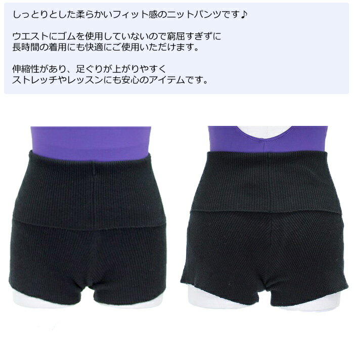 【サンシャ】L0656C ウエスト折り返しショートパンツお好みで調節可能!腰まであったかニットパンツ薄手でオールシーズン使いやすい、フィット感のあるニットパンツです♪ウエストにゴムを使用していないので窮屈すぎずに長時間の着用にも快適にご使用いただけます。伸縮性があり、足ぐりが上がりやすくストレッチやレッスンにも安心のアイテムです。着用スタッフからのコメント 「3/4を着用しました。自分の好みのサイズにアレンジが出来るのでとても使いやすかったです。光沢感のあるレオタードにもズレる事なくピタッと着用出来ました。シンプルなデザインで腰まで温かいので、 バレエのない日には普段使いで腹巻きとしてもオススメです。」by スタッフA色:ブラック、バーガンディサイズ:2/3、3/4、5/6素材:コットン57%、アクリル29%、ナイロン11%、スパンデックス3%【パンツサイズ表】2/3:対応ウエスト50-62cm、対応ヒップ70-85cm3/4:対応ウエスト55-67cm、対応ヒップ75-90cm5/6:対応ウエスト60-72cm、対応ヒップ80-95cm薄手でオールシーズン使いやすい、フィット感のあるニットパンツです♪ ウエストにゴムを使用していないので窮屈すぎずに 長時間の着用にも快適にご使用いただけます。 伸縮性があり、足ぐりが上がりやすくストレッチやレッスンにも安心のアイテムです!