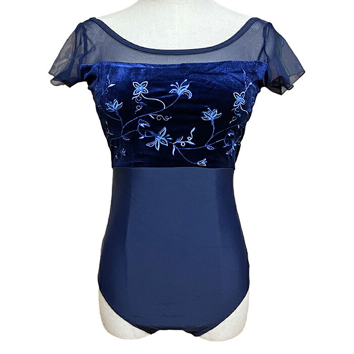 バレエ レオタード 大人 【サンシャ】 50BA1154P (JOLIETTE) ジュリエット ベロア 刺繍 半袖 バレエレオタード ジュニア バストポケット付き 半袖 メッシュ おしゃれ ストレッチ 伸縮 花柄 レッスン 練習 着 ネイビー 紺 145 150 155 160 165 170