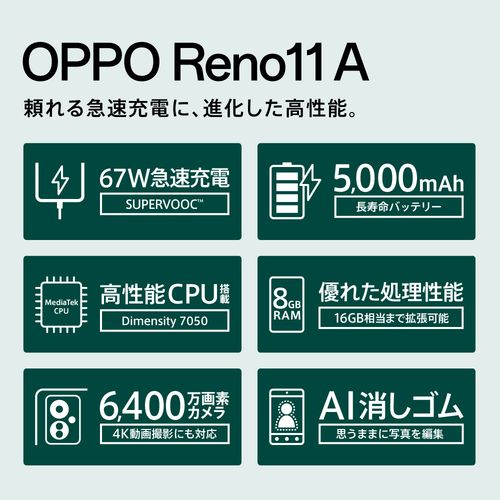 ↑↑↑正確な在庫状況は上記バナー「在庫状況を確認する」をクリックして頂き、必ずご確認ください。 ■大容量&長寿命バッテリー、最大67W急速充電:余裕の大容量5000mAhバッテリーと便利な急速充電、そして長寿命。スマートフォンを使う上で気になるバッテリーに関する大切なポイントをきちんと押さえました。■軽快な処理性能、RAM拡張機能でサクサク操作:MediaTek Dimensity 7050によるワンランク上の処理性能とサクサクの操作感。日常をもっとスマートにする頼もしい パートナーたる理由が、ここにあります。■4K動画&6400万画素カメラ、AI編集で遊び方いろいろ:高画質の写真や動画を撮影できる、さらに進化したカメラ性能に最新のAI編集機能を搭載。大切な思い出をもっと楽しく、高精細に残せます。CPH2603PLSIMフリー:○OS:ColorOS 14(Android 14ベース)CPU:MediaTek Dimensity 7050 オクタコア 2x2.6GHz+6x2.0GHzメモリ:8GB内部ストレージ:128GBディスプレイ サイズ:6.7型有機EL 解像度:2412x1080 対応周波数(バンド) 5G: Sub6:n1/n3/n28/n41/n77/n78 ミリ波:非対応 4G(LTE): FDD-LTE:B1/B2/B3/B4/B5/B7/B8/B12/B13/B17/B18/B19/B20/B26/B28 TD-LTE:B38/B39/B40/B41/B42 3G(WCDMA):WCDMA:B1/B2/B4/B5/B8/B19カメラ機能 インカメラ:3200万画素(F2.4) アウトカメラ:広角6400万(F1.7)+超広角800万(F2.2)+マクロ200万(F2.4)センサー GPS:○(GPS/Beidou/GLONASS/GALILEO/QZSS) 磁気センサ(電子コンパス):○ 光センサ:○ 加速度センサ:○ ジャイロスコープ:○ 近接センサ:○ 生体認証:指紋認証/顔認証無線LAN規格:IEEE802.11a/b/g/n/ac/axBluetooth規格:Bluetooth5.2NFC:○(Felica対応)インターフェース SIMカードスロット:nanoSIMx2/eSIM(eSIMはSIM2と排他利用) メモリーカードスロット:microSDXC(最大2TB)※SIM2と排他利用 USBポート:USB2.0 Type-Cx1 オーディオ:無バッテリー 容量:5000mAh 充電時間:約48分(67W時) 連続通話時間:約1338分 連続待受時間:約623時間寸法:幅 75×高さ 162×奥行 7.6mm質量:約177g付属品: 保護フィルム(試供品)(貼付済み) SIM取出し用ピン(試供品) クイックガイド 安全ガイド