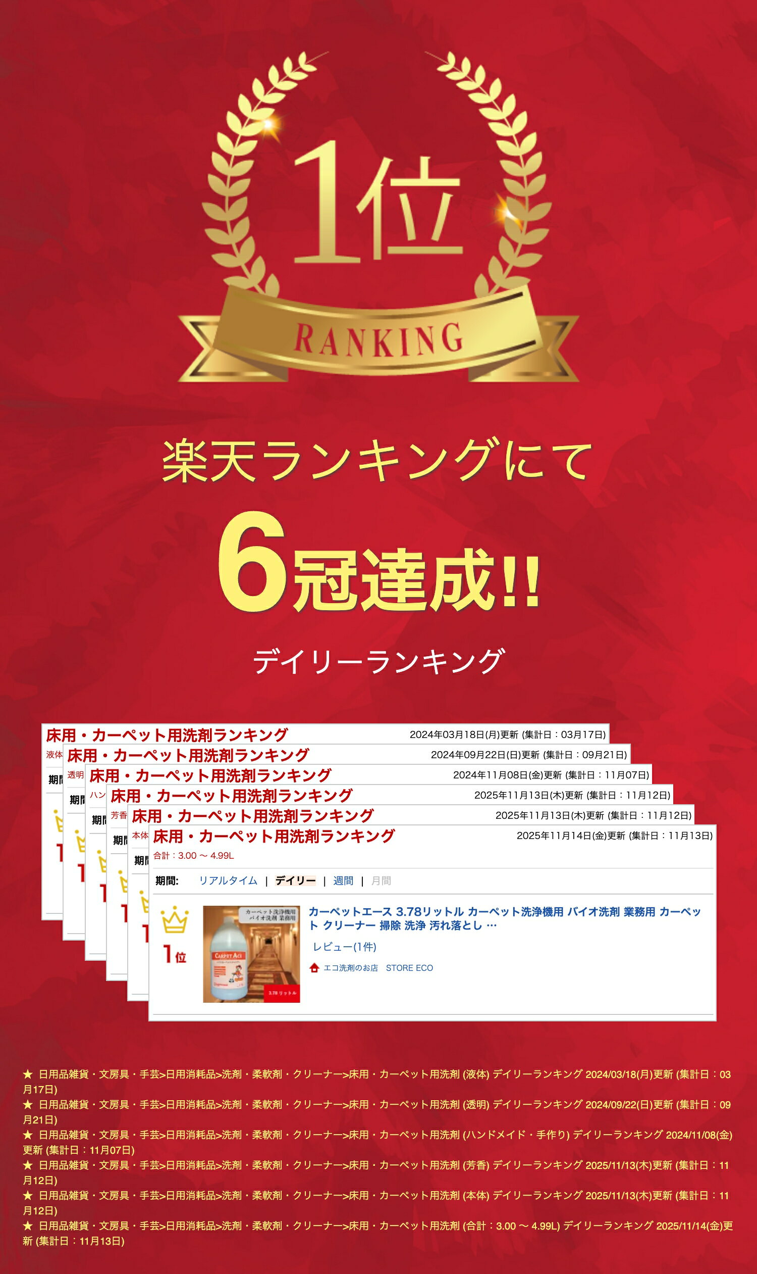■カーペットの全体洗浄に最適なカーペット洗剤 カーペットエース バイオ最先端技術国で開発された有用バクテリアを配合した環境にやさしく、洗浄力に優れた業務用カーペット洗剤です。カーペットエースに配合されたバクテリアはカーペットの繊維の奥にまで浸透し、汚れを水と二酸化炭素に分解します。また残留している洗剤成分もバクテリアが分解処理するため、リンサーなどの後処理も簡単で、きれいに仕上がります。 カーペット洗浄の前処理剤として、またポリッシャー等の洗浄機の洗剤タンクに入れてご使用ください。また綿パットなどの拭きあげ作業にも最適です。ビルメンテナンス会社様、ハウスクリーニング会社様など多くのお客様にご愛用頂いております。 ■カーペットエースの特徴 ・人と環境にやさしい ・カーペットの汚れを水と二酸化炭素に分解 ・洗剤が残留しにくいため、すすぎが早くまた洗浄パットでの拭き上げ作業にも最適。 ※洗浄パット…ポリッシャーに装着する綿製のパットやマイクロファイバー製の洗浄用パット ・バクテリアは人と環境に無害な納豆菌の仲間 ・バクテリアが有機物を環境に無害な水と二酸化炭素に分解 ・中性タイプで塩素や酸を使わず安心 ■カーペットエースの洗浄のメカニズム カーペットエースには、洗剤の主成分である界面活性剤とバクテリアが配合されています。まずカーペットの汚れや臭いに対し界面活性剤が素早く作用し、その後バクテリアが持続性を発揮しながらカーペットの奥に溜まった汚れや臭いも元である有機物を環境に無害な水と二酸化炭素に分解していきます。主成分のバクテリは、納豆菌の仲間を中心とした安全性の極めて高い善玉バクテリアです。またバクテリアは有機物を食べることにより体内に栄養源を蓄え、15分〜20分に一度細胞分裂を繰り返し増殖していきます。これによりカーペット洗浄後もカーペットが乾くまでの間バクテリアが活性し続け、汚れを分解していきます。またカーペットに残留した界面活性剤もバクテリアが分解するため、再汚染の誘発を防ぎます。 ■カーペットエースはこんな方におすすめです ●効率的に作業したい →ブラシが届かないカーペットの根元までバクテリアが浸透し汚れを元から分解します。作業後カーペットが乾くまでの間、汚れの分解作用、消臭効果が長続きします。 ●作業者のために安全な洗剤を使いたい →バクテリア主成分の中性タイプで作業者や環境にやさしく安心してお使いいただけます。 ●カーペットの汚れから発生する臭いも消臭したい →飲みこぼし、嘔吐物、汚物の汚れから発生する臭いもバクテリアが分解消臭します。 ■カーペットエースの使用方法 ●ウェットクリーニング(ポリッシャー洗浄+リンス作業) 1.最初にバキュームクリーナーでカーペットの土砂やほこりを取り除いてください。 2.原液を水または40℃前後のぬるま湯で希釈後、カーペットにスプレーヤーで噴霧もしくは洗剤タンクに投入してください。 3.ポリッシャー、エクストラクター等のカーペット洗浄機で洗浄及びリンス作業(汚水回収)を行ってください。 ●ボンネットクリーニング(パッドを使用した拭き上げ作業) 綿パッドやマイクロファイバーパッドを使用した拭き上げ作業(ボンネットクリーニング)にも最適です。 カーペットエースをスプレーヤーで散布した後、ポリッシャーに洗浄用パッドを装着し拭き上げてください。 ※縮みの激しい天然素材には使用できません。繊維の変色、日焼け跡には効果がありません。カーペットを変色してしまったシミや固形化しているシミは完全に落ちない場合があります。いずれの場合も必ず目立たないところで試してからご使用ください。 【希釈倍率の目安】 重度の汚れ 7〜10倍 中度の汚れ 20〜30倍 軽度の汚れ 50倍 ■カーペットエース Q&A Q カーペットシャンプーになぜバクテリアを配合しているのですか? A ブラシやパッドが入り込まないカーペット繊維の奥に入り込んだ汚れや悪臭を分解してくれるからです。 Q バクテリアは安全ですか? A 地球上に生息しているバクテリアのうち、約95%は人間にとって無害の善玉バクテリアだと言われています。身近なところでは、醤油、お酒、納豆など人間は昔からバクテリアと共存してきました。この製品に含まれているバクテリアも人間にとって害のない善玉バクテリアを使用しております。 Q バクテリアは永遠に活動し続けますか? A 冬眠状態のバクテリアは約15分から20分で活動を開始します。カーペットに水分が残っている間は活動し続けます。その後餌(汚れ)や水分がなくなると自然死してしまいます。 Q バクテリアの死骸がカーペットに残りませんか? A バクテリアの大きさは約1/1,000mmで空気中の塵より小さいものです。残留するというレベルではありません。 Q どんな汚れに効果がありますか? A コーヒー、紅茶、ソース、ドレッシング、血液など有機物のシミを完全に分解します。泥汚れにも使用できます