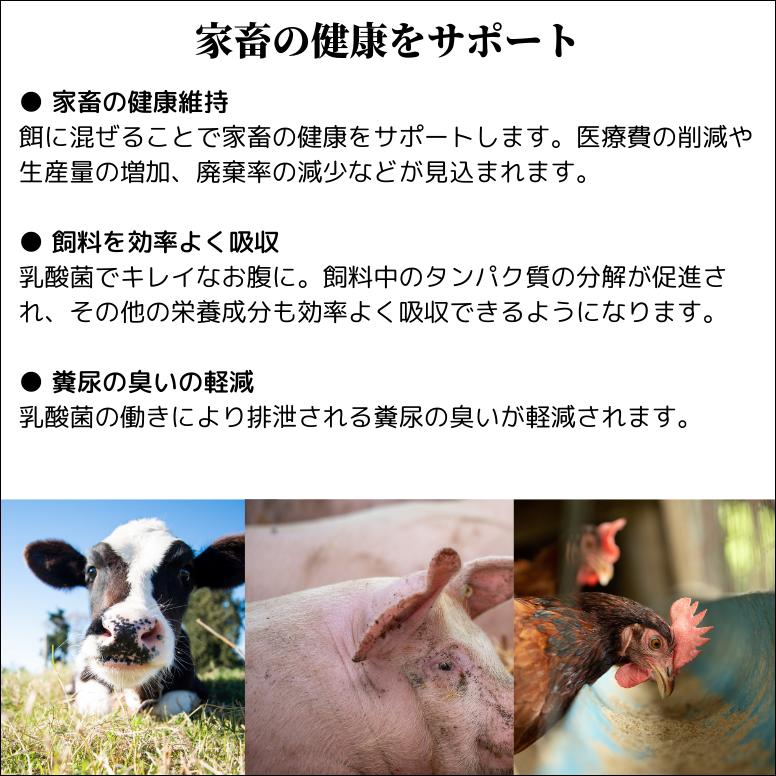 ■ ぼっけぇー牧場 5リットル 乳酸菌 発酵 家畜用混合飼料 A飼料 畜産 家畜 牛 豚 鶏 魚 家畜 健康維持 糞尿 悪臭 消臭 臭い軽減 家畜の健康をサポート ● 家畜の健康維持 餌に混ぜることで家畜の健康をサポートします。医療費の削減や生産量の増加、廃棄率の減少などが見込まれます。 ● 飼料を効率よく吸収 乳酸菌でキレイなお腹に。飼料中のタンパク質の分解が促進され、その他の栄養成分も効率よく吸収できるようになります。 ● 糞尿の臭いの軽減 乳酸菌の働きにより排泄される糞尿の臭いが軽減されます。 ■ 乳酸菌で発酵させたA飼料 「ぼっけぇー牧場」は、鶏、牛、豚、魚にご使用いただける混合飼料「A飼料」です。配合飼料に対し、0.1%〜1%添加することで、飼料の吸収を促進し、家畜の健康維持をサポートします。 ※注意 この飼料は、上記対象家畜などに記載されているもの以外には使用できません。販売する場合は、飼料安全法(第50条)において、各都道府県知事へ事業を開始する二週間前までに飼料販売業者の届け出が義務付けられています。(販売飼料の種類は「植物質・糖類発酵飼料」となります) 当店は飼料販売業者として届け出済みです。 A飼料とは、飼料等及びその原料のうち、農家において反芻動物(牛、めん羊、山羊、しかをいう。)に供給される又はその可能性のあるもとして動物由来たんぱく質等が混入しないように取り扱われるものを言います。・・・A飼料であれば鶏、豚、にも供給できます。 ・ 下痢 治療回数の軽減 哺育期間(87日齢)における、軟便・下痢・治療の回数を日誌に記録。 軟便回数には差がなかったが、下痢において平均0.3試験区の方が軽減された。治療回数については0.7回軽減されたことが哺育管理台帳から認められた。 試験の結果、「ぼっけー牧場」を与えた試験区は対照区に比べ症状の回数が軽減。治療回数の軽減は治療費の節約につながります。 ・ 体重増加について 「ぼっけー牧場」を与えた試験区と、他社商品を与えた対照区とで 体重増加を比較。 対照区で155.8%の増加、試験区で165.1%に。 試験の結果、「ぼっけー牧場」を与えた試験区は対照区に比べ9.3%の増体効果!! ・ 糞便中の菌数検査 「ぼっけー牧場」を与えた5頭(試験区)の糞便中の大腸菌数の平均値は、他社商材(対照区)の平均値に比べ減少。「ぼっけー牧場」を与えると糞便中の大腸菌より乳酸菌が増加、微生物のバランスが改善! ■ お客様の声 ・ 中国四国酪農大学校様の声 ぼっけぇー牧場を子牛のミルクに添加しています。 与えるようになってから、下痢になりにくく、子牛が元気になったようです。 ・ 安富牧場様の声 ぼっけぇー牧場を、エサに混ぜてたべさせたところ、牛の体調の崩れやすい時期に風邪もひかなく、季節の変わり目に流行する下痢の症状も起こらない、餌の食べ残しが異臭を放たないなど、好結果に喜んでいます。 ・ アルム様の声 ぼっけぇー牧場を、水に加えて飲ませたところ、ヒナの体調の崩れた時の斃死率が抑制できました。また、飼料に混ぜて与えると飼料の嗜好性が良くなり、体重増加にも効果があるようです。 ■ ぼっけー牧場の使い方 配合飼料に対して本製品を0.1%〜1%加えて与えてください。 ●酪農ではこんな効果 ・ 牛1頭あたりの年間搾乳量の増加 ・ 経費削減 ・ 病気の減少・抑制 ・ 下痢の減少・抑制 ・ 飼料効率アップ ・ 糞の臭いの軽減 ●採卵養鶏での使い方 配合飼料に添加することで体重増加、タンパク質吸収の促進効果 ・ ケージ飼育の場合、1日の飼料摂取量に対しぼっけぇー牧場が0.1%になるようにエサ桶上に直接散布。 ・ サイロに投入する場合、飼料に対してぼっけぇー牧場が0.1〜1%になるようにローリー車の中で混合します。 ※水分過多で長期保存するとカビが生える恐れがあるので加える水の量にご注意ください。 ■ 乳酸菌で発酵させた家畜用混合飼料(A) 【対象家畜 牛 豚 鶏 魚 家畜の健康維持 糞尿の臭い軽減】 「ぼっけぇー牧場」は、100%植物性原料を用い、乳酸菌で発酵させた家畜用の混合飼料「A飼料」です。糖蜜、米ぬか、ナタネ油粕、大豆油粕、大豆たんぱく質などの原料に乳酸菌を加えて発酵させて完成させました。独自の乳酸菌によって発酵させた発酵エキスが、腸内環境を改善し、消化吸収の改善・体重増加が期待できる他、嗜好性を高めます。 原材料名:糖蜜、砂糖、米ぬか、なたね油かす、大豆油かす、濃縮大豆タンパク、乳酸菌 関連商品ぼっけぇー牧場 10リットル 送料無料 乳酸菌 発酵 家畜用混合飼料 ...BTO(A) 5リットル 植物 元気 土壌活性 農業用 土壌改良剤 土...フォーミュラ G-510EF 1ガロン 3.78L ボトル 濃縮原液入...19,800円9,900円9,130円フォーミュラG-510EF 1G 3.78リットル ボトル 濃縮原液 ...ROEBIC L-75 4リットル グリストラップ グリース阻集器 管...業務用 洗剤 厨房 消臭 グリストラップ グリーストラップ 床 ダクト...9,130円7,800円7,700円旭化成 すくいん棒 小 グリストラップ グリーストラップ グリース阻集...TSC トイレ便座除菌シ