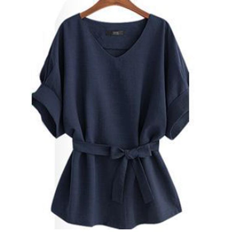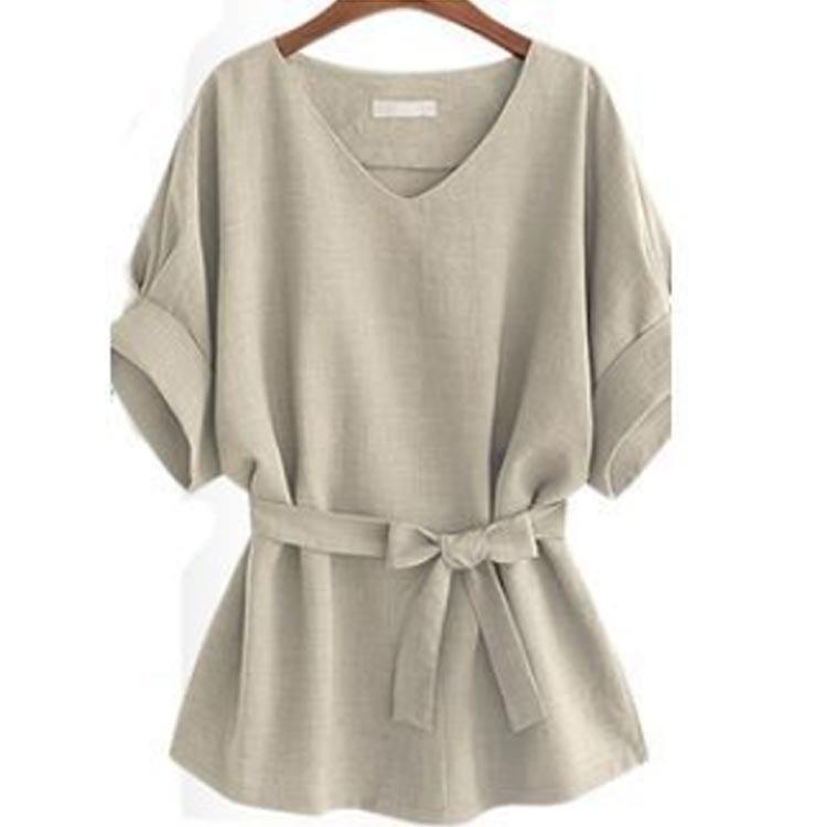 綿麻Tシャツ トップス レディース 春秋 ロングTシャツ 半袖 ゆったり 大きいサイズ 体型カバー 通勤 通学 カジュアル Vネック ビジネス リボン