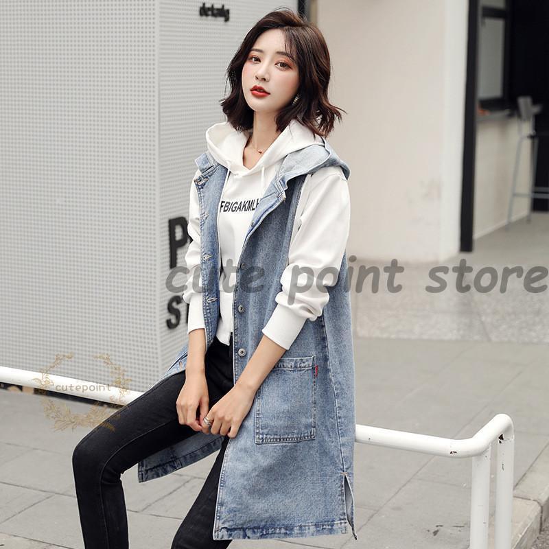 デニムベスト ジレ レディース デニム ロング丈 アウター 前開き 羽織り 秋服 ノースリーブ ゆったり 着痩せ 体型カバー 楽ちん パーカー