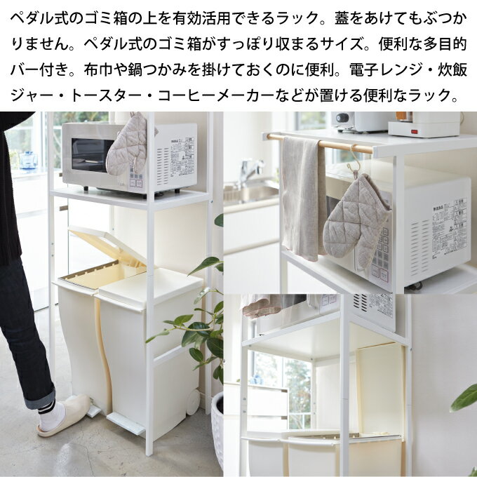 ペダル式のゴミ箱の上を有効活用できるラック。蓋をあけてもぶつかりません。 ペダル式のゴミ箱がすっぽり収まるサイズ。便利な多目的バー付き。布巾や鍋つかみを掛けておくのに便利。 電子レンジ・炊飯ジャー・トースター・コーヒーメーカーなどが置ける便利なラック。商品詳細 商品名tower タワー ゴミ箱上ラック 品番:772859 ポイントペダル式のゴミ箱の上を有効活用できるラック。蓋をあけてもぶつかりません。 ペダル式のゴミ箱がすっぽり収まるサイズ。便利な多目的バー付き。布巾や鍋つかみを掛けておくのに便利。 電子レンジ・炊飯ジャー・トースター・コーヒーメーカーなどが置ける便利なラック。 サイズ約幅55×奥行45×高さ130cm 素材本体/スチール(粉体塗装) ハンガーバー/天然木 重さ約9.3kg 耐荷重各棚/約10kg ハンガーバー/約2kg 付属品六角レンチ 備考組立式