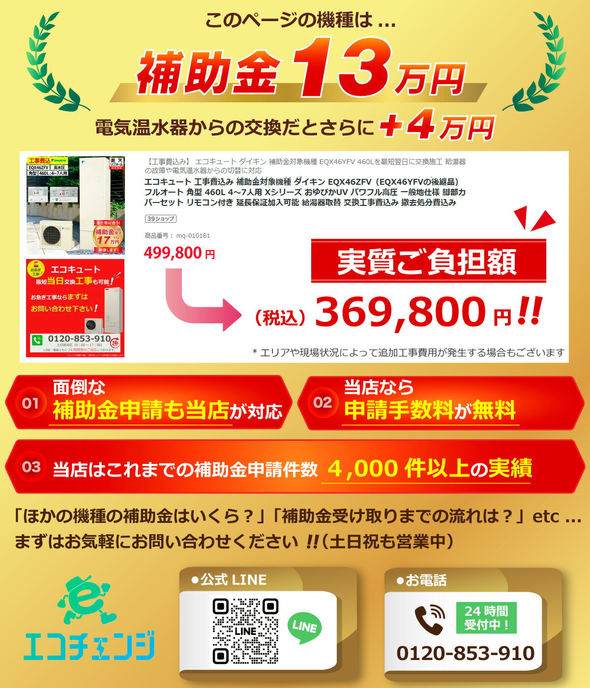 ・セット内容: ※こちらの機種は補助金対象機種となります。 ※補助金申請は無料で承っております。 ダイキン エコキュート EQX46ZFV 本体・リモコンセット・脚部カバー付 ・主 な 仕 様:フルオート 角型 Xシリーズ(パワフル高圧) 一般地仕様 ・タンク容量:460L 角型 4〜7人用 ・付 属 品:リモコン BRC083H1 脚部カバー KKC022E4 ・貯湯ユニット寸法 高さ2,175×幅630×奥行き730mm 質量 69kg ・ヒートポンプユニット寸法 高さ735×幅825(+74)×奥行き300mm 質量 58kg ■当商品をご検討中のお客様へ■ より快適、便利、経済的にご利用頂く為に、 これらの機種もご提案申し上げます! <同タイプ370Lモデル> ご家族構成の変化に応じて適切な容量をお選び下さい! ●370Lは3〜4人世帯、460Lは4〜7人世帯が目安です! <標準水圧モデル> エコキュートの標準的な水圧のモデル! ●水回りが1階にある場合の標準的な水圧です! ●高水圧タイプよりも価格が少々リーズナブルです! <商品10年保証> 修理費用ご負担無しで修理が受けられる10年間の保証! ●エコキュートやエコワンに故障などの機器トラブルが発生した時、修理費用ご負担無しで修理が受けられる10年間の保証です! 迅速・丁寧・安心な工事を常に手掛けています。 お気軽にご相談下さい! <ご対応可能なエリア> 【東北】岩手 【北陸】新潟、富山、石川、福井 【関東】東京、神奈川、埼玉、千葉、茨城 【中部】山梨、静岡、愛知、岐阜、三重 【関西】兵庫、大阪、京都、和歌山、奈良、滋賀 【中国】岡山、広島、島根、山口 【九州】福岡、大分、熊本、宮崎 ※沖縄、離島は対応エリア外となります。 ※一部対応できない区域・遠方費のかかる区域もございます。 ※エリアによっては現在庫が欠品中の場合もございます。 その場合は発注→納品→工事の流れでのご対応となります。 範囲外でも対応可能な場合等もございます。お気軽にご相談下さいませ。 ご購入前にお住まいの地域をお知らせ下さいますようお願い致します。 キャンセル可否:不可 ご注文前に必ず内容をご確認頂きご注文ください。 工事費込みの商品につきましては原則としてキャンセルをお受けできかねます。 ご不明な点についてはご注文前にお問合せください。 〇商品の保証に関しては初期のメーカー保証のみ となります。商品の機能性、有効性については 保証致しておりません。 〇モニターの発色の具合により色合いが異なって見える場合がございます。メーカー希望小売価格はメーカーカタログに基づいて掲載しています迅速・丁寧・安心な工事を常に手掛けています。 お気軽にご相談下さい! ご対応可能なエリア 【東北】岩手 【北陸】新潟、富山、石川、福井 【関東】東京、神奈川、埼玉、千葉、茨城 【中部】山梨、静岡、愛知、岐阜、三重 【関西】兵庫、大阪、京都、和歌山、奈良、滋賀 【中国】岡山、広島、島根、山口 【九州】福岡、大分、熊本、宮崎 ※沖縄、離島は対応エリア外となります。 ※一部対応できない区域・遠方費のかかる区域もございます。 ※エリアによっては現在庫が欠品中の場合もございます。 その場合は発注→納品→工事の流れでのご対応となります。 範囲外でも対応可能な場合等もございます。お気軽にご相談下さいませ。 ご購入前にお住まいの地域をお知らせ下さいますようお願い致します。