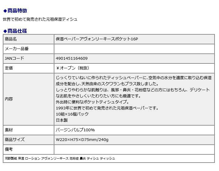 ※こちらの商品は在庫商品の為、ご注文後2〜5営業日後の出荷予定となります。※メーカー在庫切れの為、5営業日以内に出荷できない場合はメールにてご案内させていただきます◆商品特徴世界で初めて発売された元祖保湿ティシュ◆商品仕様商品名保湿ペーパー ポケットティッシュ アヴォンリーキース 10組×16P 40個セットメーカー品番 JANコード4901451164609定価¥オープン(税抜)内容じっくりていねいに作られたティッシュペーパーに、空気中の水分を適度に取り込む保湿成分を配合し、天然由来のスクワランもプラス致しました。しっとりやわらかな肌触りは、風邪・鼻炎・花粉症などの方にはもちろん、デリケートなお肌をやさしくいたわりたい方にも最適です。外出時に便利なポケットティシュタイプ。1993年に世界で初めて発売された元祖保湿ペーパーです。10組×16個パック日本製素材バージンパルプ100%商品サイズW220×H75×D75mm/240g備考 河野製紙 保湿 ローション アヴォンリーキース 花粉症 鼻炎 ティシュ ティッシュ