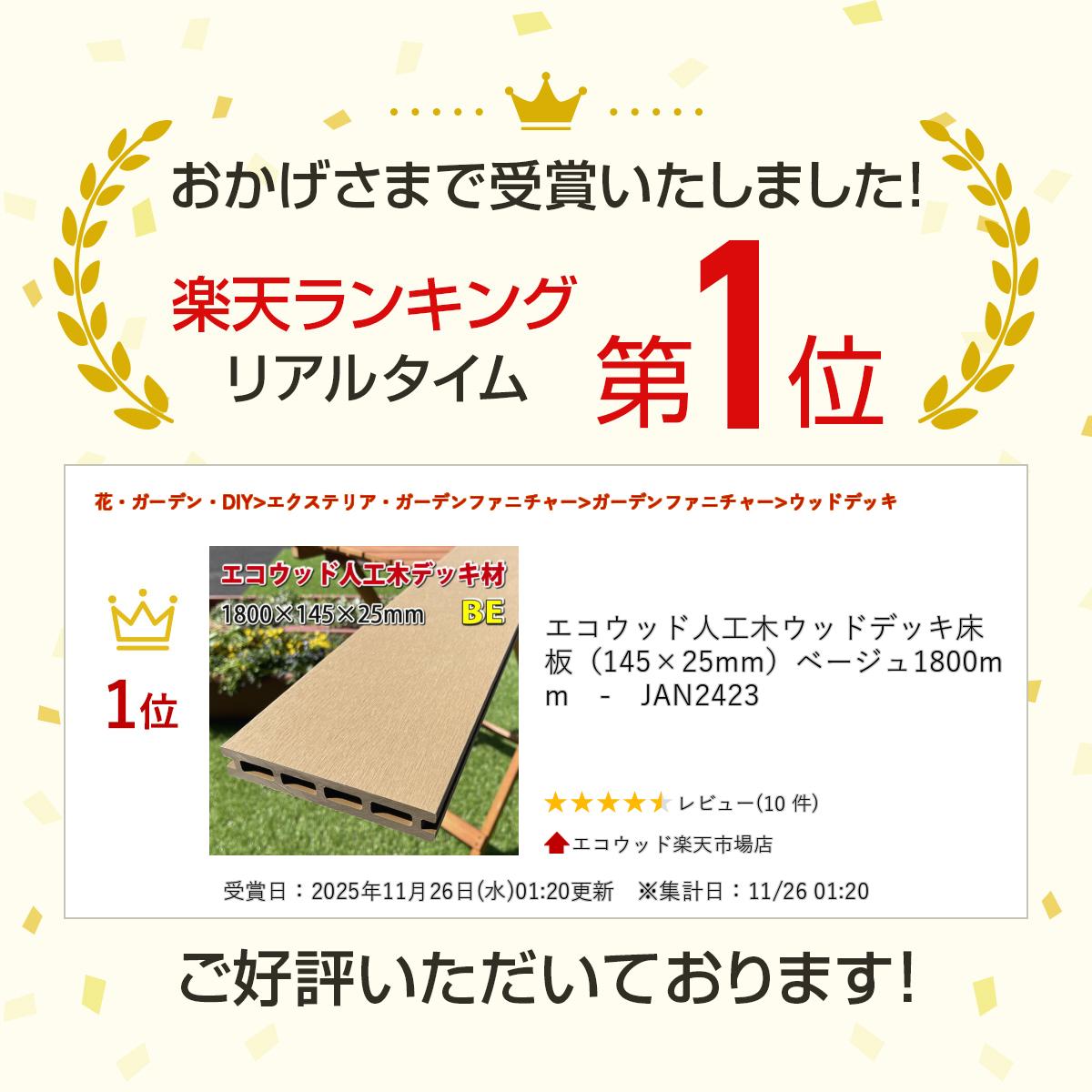エコウッドの人工木材はメンテナンスがほとんどいらず、天然木に比べ卓越した耐久性を誇っています! ノコギリなどで簡単に加工できるので、とても扱いやすく、床板の張り替えなどにも最適な人工木製のデッキ部材です。 (2024/12) エコウッド人工木デッキをリニューアルしました! 肉厚を4ミリ厚くして、床板の強度をプラスしました。さらに新色入荷♪ ■サイズ:幅145×厚み25×長さ1800ミリ ■重量:5.8kg ■素材:人工木材 ■色:ベージュ色 【 人工木デッキ床材の特徴につきまして 】 ■人工木のデッキは天然木に比べて格段に耐久性が良く、ささくれやひび割れが出ないため安全に使用することができ、木の質感がとても綺麗に出ています。「肉厚で耐久性に優れた人工木デッキ床板材です♪」 「こちらはデッキ床板のカラーバリエーションです。お庭の雰囲気に合わせて、床板材をご検討いただくことができます♪」 「木目調の無地と縦スリット柄のリバーシブルタイプですので、お好みで使い分けることが可能です♪」 「専用金具を使用して固定することで、表面にビスが見えずに安全でキレイなデッキ表面に仕上がります♪」 「こちらはエンド部分の固定金具です♪」 ☆ エコウッド人工木デッキ床板材の他カラーはこちらです ☆↓ ■ エコウッド人工木デッキ床板材(ブラウン) ■ エコウッド人工木デッキ床板材(ベージュ) ■ エコウッド人工木デッキ床板材(ダークブラウン) ■ デッキ床板固定金具 ■ デッキ床板固定金具(端部用) ■ デッキ床板材カラーサンプル ☆ エコウッド人工木デッキ幕板材120mmはこちらです ☆↓ ■ エコウッド人工木幕板材(120×11mm)(ブラウン) ■ エコウッド人工木幕板材(120×11mm)(ベージュ) ■ エコウッド人工木幕板材(120×11mm)(ダークブラウン) 「こちらは人工木デッキ床板と人工木幕板120mmを使用して製作した人工木縁台です。 横幅なども自由に設計できるのでDIYにおすすめです♪」 「こちらは事務所周りに設置した人工木デッキ(ベージュ)色です。 建物をぐるりと囲み、憩いのスペースが出来上がりました♪」 「こちらはマンションベランダに設置した人工木デッキ(ベージュ)色です。 木と同じ扱いができるので、切り欠きなども自由に行うことができます♪」 「さらにこちらはダークブラウン色の人工木デッキ床板と幕板を使用して設置した人工木製のベンチです。落ち着いた雰囲気を出すことができます♪」 「そしてこちらはバルコニーの古くなったデッキを撤去して、新しく人工木デッキに張り替えさせていただいた設置例です。 縁台なども配置して、憩いの空間が出来上がりました♪」 「マンション一階の専用庭へ設置した人工木ウッドデッキ(ベージュ色)です♪」 ↓『人工木フェンスや支柱・その他商品一覧です♪』↓ ↓『人工木フェンスの設置例、使用した部材を詳しくご紹介しています♪』↓
