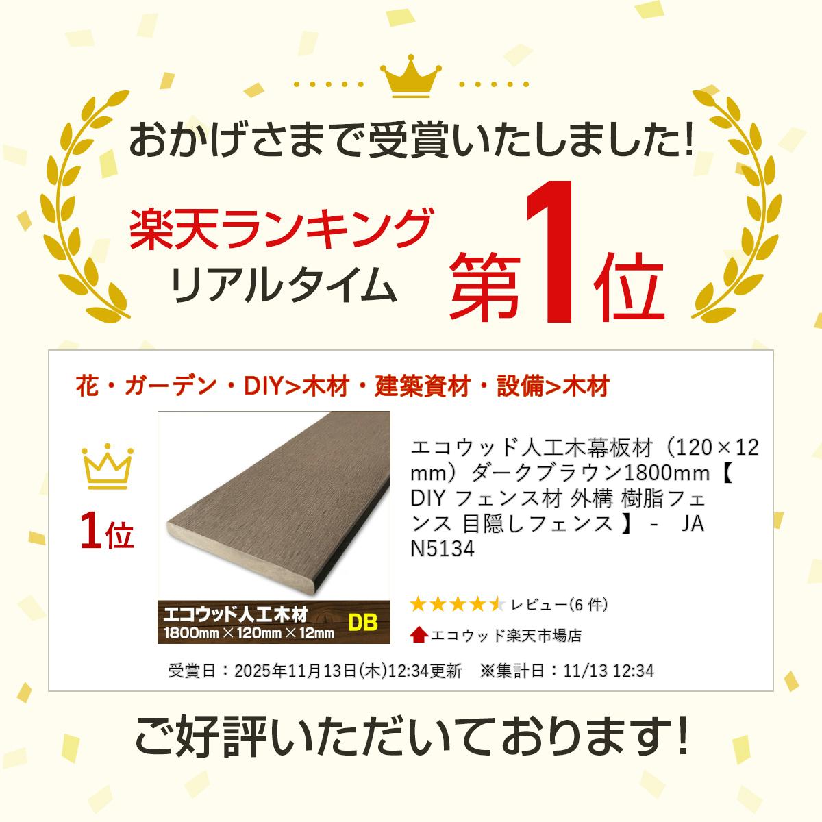 エコウッド人工木幕板材です!バリエーション豊富に5色からお選び頂けます♪ エコウッドの人工木材はメンテナンスがほとんどいらず、天然木に比べ卓越した耐久性を誇っています! ノコギリなどで簡単に加工できるので、とても扱いやすく、内装材の化粧材や、デッキ幕板材、フェンス部材としても幅広く用途のある規格材です。 ■サイズ:1800×120×12ミリ ■重量:3.6kg ■素材:人工木材 ■色:ダークブラウン色 ■特徴:無垢材。人工木材はノコギリなどで簡単に加工できるので、とても扱いやすく、屋外などで様々な用途にご利用いただけます。 ※支柱の間隔は、約900ミリごとに1本の支柱を立てていただきますようお願いいたします。 ※商品総額¥30,000以上で送料無料にてお届けします♪「表面を荒し加工しているため見た目は本物の木のようですが、人工木製の無垢材です。 たいへん長持ちするのが特徴となっています☆」 「人工木材120mm×12mmにて設置した、人工木フェンス(ダークブラウン)設置例をご紹介いたします☆こちらは全体幅10m×9m、高さ約170cmのL型仕様(DB)です。」 「続いてこちらは全体幅6m+4m、高さ約120cmの直線仕様の人工木フェンス(DB)です☆」 「さらにこちらはお庭の周囲に高さ約130cmにて設置した、カギ型仕様の人工木フェンス(DB)です☆」 「こちらは人工木デッキ床板と人工木幕板120mmを使用して製作した人工木縁台です。 横幅なども自由に設計できるのでDIYにおすすめです♪」 ☆ 人工木材120mm幅の別カラー商品はこちらです☆↓ ■ エコウッド人工木幕板材(120×12mm)(ブラウン) ■ エコウッド人工木幕板材(120×12mm)(ベージュ) ■ エコウッド人工木幕板材(120×12mm)(ダークブラウン) ■ エコウッド人工木幕板材(120×12mm)(ホワイト) ■ エコウッド人工木幕板材(120×12mm)(ブラック) ↓『人工木フェンスや支柱・その他商品一覧です♪』↓ ↓『人工木フェンスの設置例、使用した部材を詳しくご紹介しています♪』↓