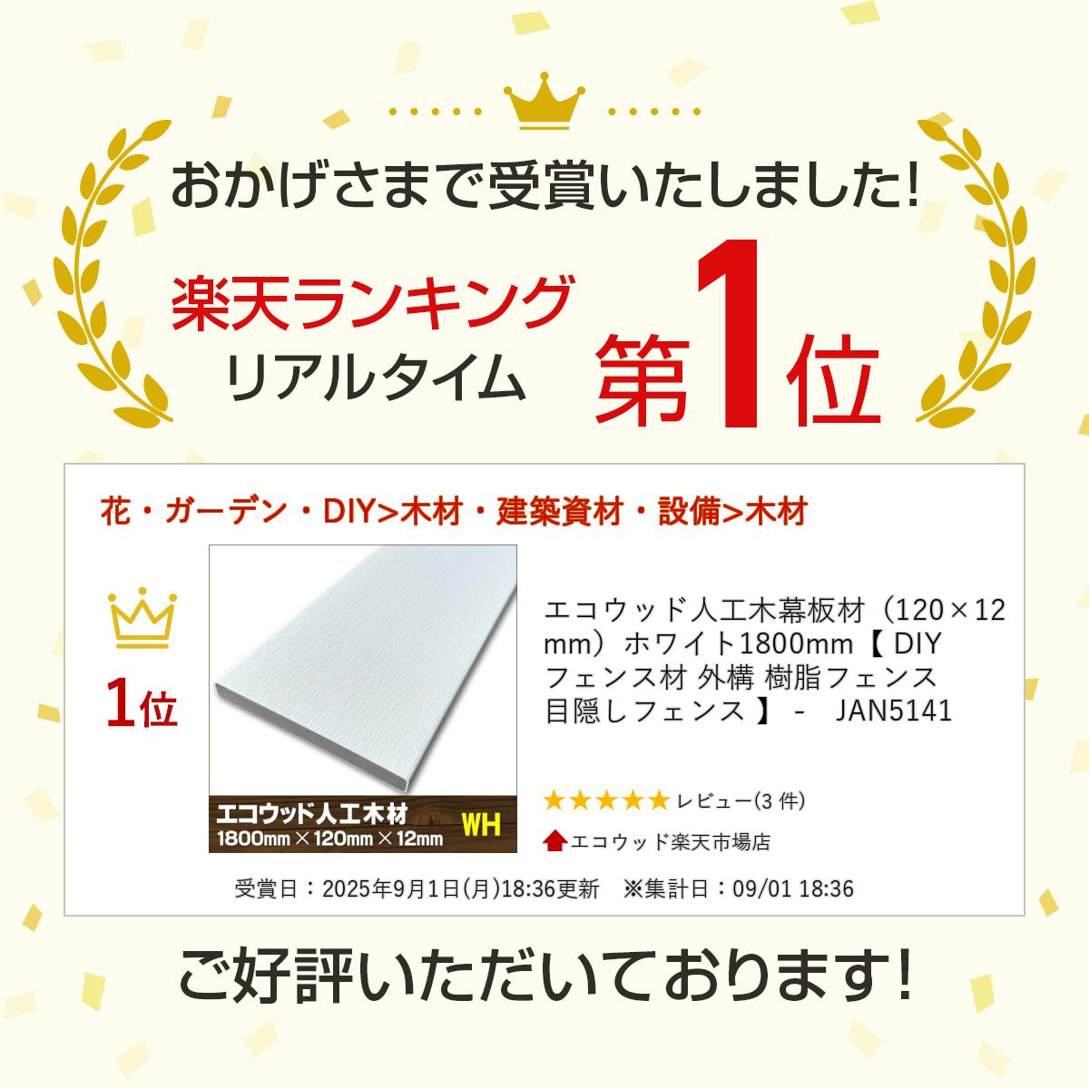 エコウッド人工木幕板材です!バリエーション豊富に5色からお選び頂けます♪ エコウッドの人工木材はメンテナンスがほとんどいらず、天然木に比べ卓越した耐久性を誇っています! ノコギリなどで簡単に加工できるので、とても扱いやすく、内装材の化粧材や、デッキ幕板材、フェンス部材としても幅広く用途のある規格材です。 ※人工木フェンス(ホワイト)がリニューアルしました。新しい人工木ホワイトは二層構造で汚れが付きにくく、美しい白さを末長く維持します♪ ■サイズ:1800×120×12ミリ ■重量:3.6kg ■素材:人工木材 ■色:ホワイト色 ■特徴:無垢材。人工木材はノコギリなどで簡単に加工できるので、とても扱いやすく、屋外などで様々な用途にご利用いただけます。 ※支柱の間隔は、約900ミリごとに1本の支柱を立てていただきますようお願いいたします。 ※商品総額¥30,000以上で送料無料にてお届けします♪「人工木フェンス(ホワイト)がリニューアルしました。 新しい人工木ホワイトは表面コートで汚れが付きにくく、しかも腐らない。美しい白さを末長くお楽しみいただけます♪」 「こちらは千葉県にお住まいのお客様宅にて、120ミリ幅の人工木材を使用して設置した、縦張り仕様のホワイトフェンスです☆」 「こちらはお客様からお送りいただいた完成写真です。 『セルフビルド故、時間がかかりましたがお陰さまでとてもステキなフェンスが完了いたしました。』 との嬉しいお返事をいただきくことができました♪ L型にきれいに設置されています。」 「さらにこちらはお庭周囲に設置した人工木縦貼りフェンスです♪ 緑の多い環境のなかホワイト色のフェンスに囲まれて、お庭がとても明るく爽やかな印象に変貌しました☆」 「こちらは人工木デッキ床板と人工木幕板120mmを使用して製作した人工木縁台です。 横幅なども自由に設計できるのでDIYにおすすめです♪」 ☆ 人工木材120mm幅の別カラー商品はこちらです ☆↓ ■ エコウッド人工木幕板材(120×12mm)(ブラウン) ■ エコウッド人工木幕板材(120×12mm)(ベージュ) ■ エコウッド人工木幕板材(120×12mm)(ダークブラウン) ■ エコウッド人工木幕板材(120×12mm)(ホワイト) ↓『人工木フェンスや支柱・その他商品一覧です♪』↓ ↓『人工木フェンスの設置例、使用した部材を詳しくご紹介しています♪』↓