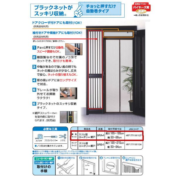 川口技研メーカーお問い合わせ:048-255-5411<スリム型ロータリー網戸 全2サイズ>● 標準サイズ(SRA-1)はこちら● ロングサイズ(SRB-1)はこちらこの商品は標準サイズ(SRA-1)です【商品説明】●チョッと押すだけ自動巻き。スピード調整もOK。●中軸付きだから強風時でもネットがたわみにくい。●ブラックネットのすっきり収納タイプ。※マンションなどの高層階や高台にある住宅など、かなり強い風が発生する場所では、ネットの「風はらみ」を起こす可能性があります。●下レールは取り外し可能だから、お掃除ラクラク。【注意事項】●強風や突風の影響を受ける場合があるため、7階以上には取付けしないでください。●マンション等協同住宅に設置する場合は、管理組合等にご確認ください。検索関連ワード(商品の説明ではありません)川口技研 SRA-1 スリム型ロータリー網戸 標準タイプ ドア用網戸 玄関 勝手口 スリム設計 コンパクト 省スペース スライド式 ロータリー構造 スリムデザイン DIY簡単取付 自宅設置 玄関網戸 勝手口網戸 ドア網戸 スリムドア網戸 標準サイズ ロータリー網戸 スライド網戸 玄関ドア用 勝手口ドア用 出入りスムーズ 室内ドア用 網戸取付 開閉スムーズ スリムロータリータイプ 川口技研製 セット商品 キット式 ハウス用 屋内外対応 隙間対策 虫対策 虫よけ 通風 採光 換気 空気循環 風通し良い 自然換気 プライバシー確保 夏対策 涼しい風 快適空間 清潔 網戸交換 リフォーム メンテナンス 簡単DIY 日よけ対策 おしゃれデザイン ブラックフレーム ドアリフォーム 戸建て マンション アパート 賃貸 住宅用 建具用 出入口網戸 ロータリー式 シンプルデザイン スリムフレーム 屋内ドア網戸 出入り便利 縦型網戸 スリム収納 静かな開閉 スマート設計 機能性 網戸アイテム 網戸用品 換気アイテム 清涼アイテム 玄関アクセサリー 涼風アイテム 生活用品 家庭用 住まいアイテム 玄関快適 室内快適 玄関虫対策 玄関換気 入口網戸 エントランス用 勝手口入口 網戸 スリムタイプ シンプル網戸 設置簡単 カット不要 優れた開閉性 店舗入口対応 家庭用網戸 ドア専用網戸 スリムモデル 安心設計 家具干渉なし 空気入替え 玄関用アイテム 便利グッズ 快適グッズ インテリア実用アイテム 雨の日換気可能 換気しやすい 風通し良い すっきり設計 美観維持 インテリアに馴染む 黒フレーム スタイリッシュ 網戸パネル セット部材 ドア用パーツ 新生活 リフォーム支援 熱気対策 室温調整 快適住宅 室内改善