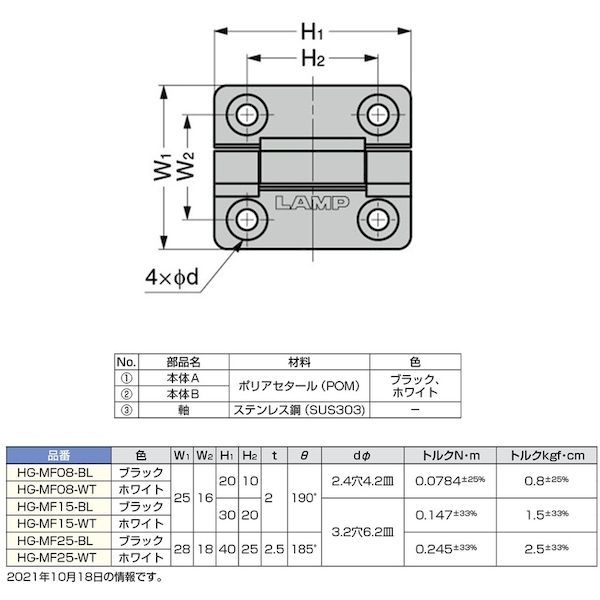 よく一緒に購入されている商品パナソニック電工 Panasonic WN39727円ベッセル VESSEL USB166100 電437円スガツネ工業メーカーお問い合わせ:03-3851-1122【特長】●樹脂製の小型トルクヒンジです。【用途】●事務機器や店舗什器などの小型軽量扉。【仕様】●全長(mm):40●定格トルク(N・m):0.245±33%●幅(mm):28●ねじ穴数:4●厚さ(mm):2.5●穴径(mm):φ3.2穴φ6.2皿●色:黒【仕様2】●弊社2万回開閉試験クリア【材質/仕上】●本体:ポリアセタール(POM)●軸:ステンレス(SUS304)【原産国】日本補足商品ワード:測定器・工具のイーデンキ edenki 業者 蝶つがい 加工 産業機械 丁番 開き蓋 本格 機械部品 メンテナンス 工作 ホビー ツール ちょう番 扉 工具 産業用機器 ドア 蝶番(トルクヒンジ) 本格 建具 簡単 便利 工場 作業現場 開閉 プロ 生産加工用品 修理 ちょうつがい 道具 DIY 強い 部品 開き戸 パーツ ちょうばん 強力 機械部品 蝶番 クラフト ふた フタ 材料類似商品はこちらLAMP HGMF15BL 170023856330円LAMP HGMF08BL 170023854302円スガツネ HG-MF25-WT 1700238375円スガツネ HG-MF08-WT 1700238302円スガツネ HG-MF15-WT 1700238330円LAMP HGJHM9UBL 170025892,923円LAMP HGJHM9SBL 170025892,923円LAMP HGJH25 170092209 H3,266円スガツネ HG-MPS2-BL 1700239587円スガツネ工業 LAMP HGYJ50BL 17632円マーベル MARVEL BL-25 BL型バイ2,633円LAMP HGJHW50 170092212 3,789円