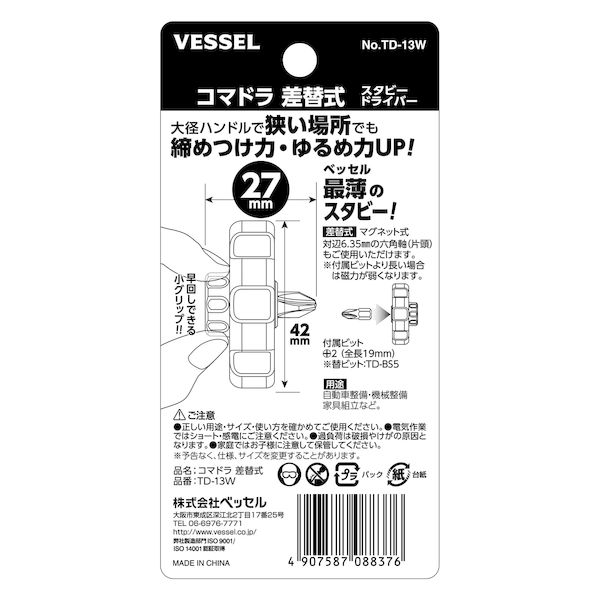 【即納在庫品】「直送」ベッセル VESSEL TD-13W コマドラ差替式スタビードライバー ビット1本付 TD−13W TD13W