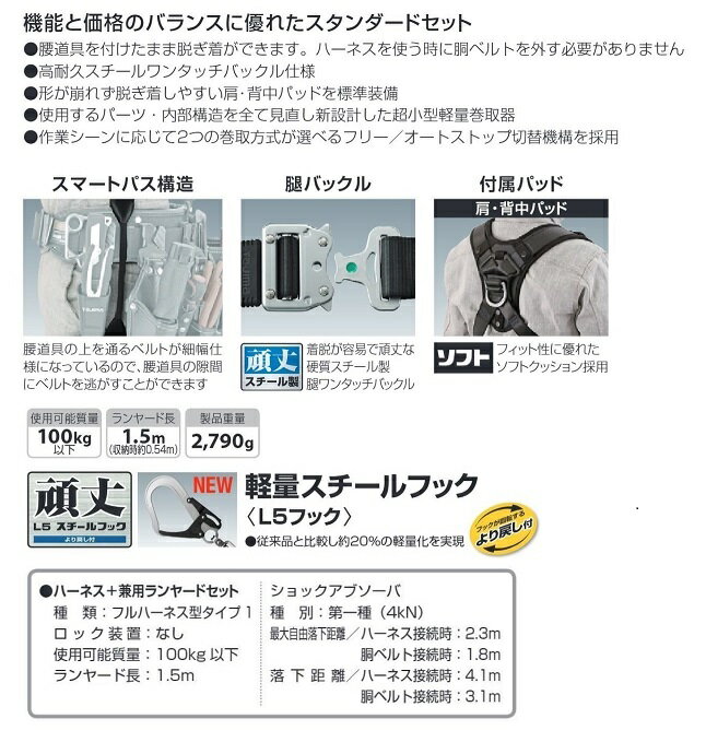 タジマ(TJMデザイン)製のハオルハ−ネスHA 黒 KR150FA シングルL5 ダブルセットのA1HSKR-WL5BK(黒、フリ−サイズ)です。 特徴 機能と価格のバランスに優れたスタンダ−ドセット! ●もう時間をムダにしない! 腰道具を付けたまま脱ぎ着ができるので、 ハーネスを使う時に胴ベルトを外す必要がありません。 低所作業と高所作業の切り替えが簡単。 ●スマートパス構造 腰道具の上を通るベルトが細幅仕様になっているので、 腰道具の隙間にベルトを逃がすことができます ●アンダーパス構造 骨盤ベルトの位置をギリギリまで下げ、 ハーネス背面下部に腰道具をすり抜ける広い空間を確保しました。 ●フリーサイズ 調整幅が広いのでどんな体型にもフィット。サイズ選びが簡単 ●頑丈スチール製 腿バックル 着脱が容易で頑丈な、硬質スチール製腿ワンタッチバックル。 ●肩・背中パッド/腿パッドを標準装備 形が崩れず脱ぎ着しやすい肩・背中パッド/腿パッドを標準装備。 フィット性に優れたソフトクッション採用 ●兼用ランヤードで経済的 これ1本で高所と低所作業どちらにも対応できます。 ●直径55mm【超小型】巻取器 ランヤード重量:590g。 直径55mmの超小型巻取器を搭載。 ●フリー/オートストップ切替機構 作業シーンに応じて2つの巻取方式が選べます。 [フリー]常にランヤード長が最短になるので安全性が高い。 [オートストップ]引き出した長さでロープが固定できるので使いやすい。 ●アジャストストッパー付 ランヤードを好みの長さに固定できます。 ●L5フック 従来品と比較し約20%の軽量化を実現! より戻し付スチールフック。 仕様 ●種 類 :フルハーネス型 タイプ1 ●ロック装置 :なし ●ショックアブゾーバ種別 :第一種(4kN) ●使用可能質量 :100kg以下 ●ランヤード長 :1.5m(収納時約0.54m) ●最大自由落下距離 ・ハーネス接続時 :2.3m ・胴ベルト接続時 :1.8m ●落下距離 ・ハーネス接続時 :4.1m ・胴ベルト接続時 :3.1m ●製品重量 :2,790g(ハーネス+ランヤード2本+パッド) ●ハオルハーネスHA :フリーサイズ セット内容 ・ハオルハーネスHS ・ハーネス用・胴ベルト用兼用ランヤード:KR150FA シングル L5×2本 ご注意! ●3枚目の画像は赤色での使用例です。 是非宜しくお願い致します! メーカー希望小売価格はメーカーカタログに基づいて掲載しています弊社へのお問い合わせ、こんな物を出品して欲しいというご要望やご希望、 またはカタログ請求をして頂く場合にも ここからメ-ルでお気軽にお問い合わせ下さい。