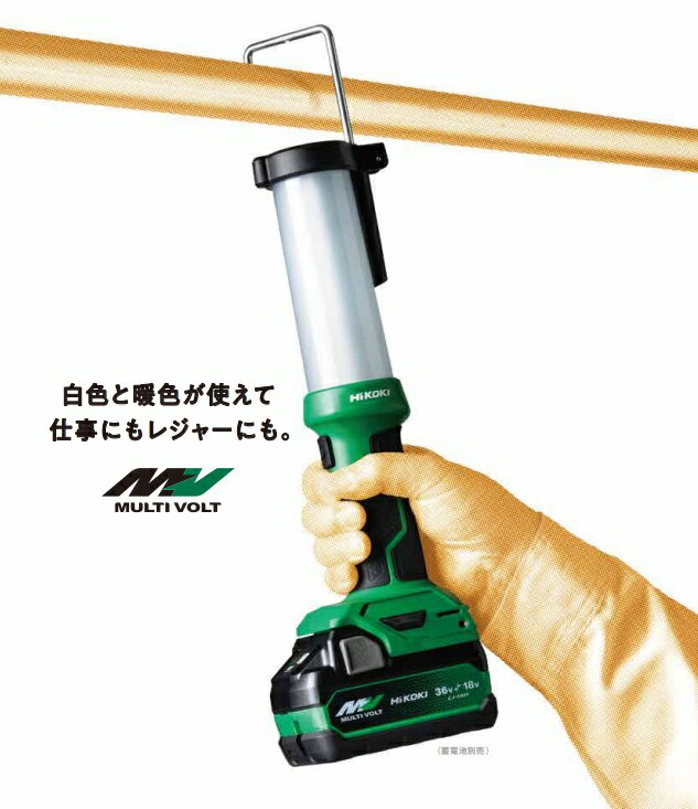 HiKOKI(旧日立工機)製のコードレスランタンのUB18DFです。 特徴 ●360°照射で死角なし ●従来製品よりも明るい ・HiKOKI製従来品UB18DDLとの比較 UB18DF:750lm(白色 強) ↑2倍以上明るい!※ UB18DDL:333lm ※ HiKOKI製従来品:コードレスランタンUB18DDLとの比較。 数値は参考値です。電池の状態や条件により異なります。 ●軽くて持ちやすい ・蓄電池未装着時0.4kg、BSL36A18X装着時1.14kg。 ・エラストマ付で持ちやすい。 ●白色と暖色で用途が広がる ・白色:手持ちで使えて仕事や停電時の移動に便利 ・暖色:ほどよい明るさの暖色でキャンプなどに活躍※ ※高所につり下げて使用する場合は、バンド(別売部品)やひもなどで固定してください。 吊り下げ状態で引っぱったりしないでください。フックは確実に引っかけてください。 また、本製品は防じん防滴構造ではありません。雨天での使用はしないでください。 ●つり下げフック 上に引き伸ばし、自由に回転させて使用できます。 仕様(スペック) ●使用電圧 :14.4V / 18V ●使用灯 :白色LED(0.2W×24灯) :暖色LED(0.2W×3灯) ●明るさ ・白 色 弱:320lm / 強:750lm ・暖 色 弱:40lm / 強:90lm ●使用可能蓄電池 :マルチボルト蓄電池(残量表示付) :18V(BSL18XXシリーズ) :14.4V(BSL14XXシリーズ) ●質 量 :0.4kg(蓄電池除く) ●機体寸法 :98×79×301mm(奥行きx幅x高さ、蓄電池除く) ●連続点灯時間※(満充電時、目安) ・蓄電池容量 18V-3.0Ah 白色 弱(320lm) :約17時間 白色 強(750lm) :約7時間 暖色 弱(40lm) :約43時間 暖色 強(90lm) :約28時間 ・蓄電池容量 18V-5.0Ah 白色 弱(320lm) :約29時間 白色 強(750lm) :約12時間 暖色 弱(40lm) :約72時間 暖色 強(90lm) :約47時間 ・蓄電池容量 18V-8.0Ah 白色 弱(320lm) :約46時間 白色 強(750lm) :約19時間 暖色 弱(40lm) :約15時間 暖色 強(90lm) :約76時間 ※連続点灯時間は参考値です。 電池の種類や充電状態、使用条件により異なります。 (蓄電池と充電器は別売です。) 是非宜しくお願い致します! メーカー希望小売価格はメーカーカタログに基づいて掲載しています弊社へのお問い合わせ、こんな物を出品して欲しいというご要望やご希望、またはカタログ請求をして頂く場合にもここからメ-ルでお気軽にお問い合わせ下さい。