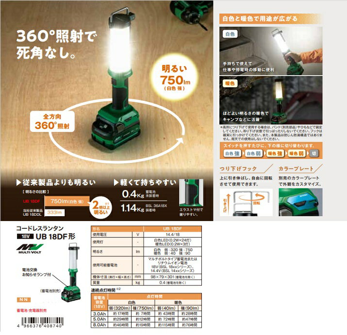 HiKOKI UB18DF 14.4V/18Vコードレスランタン 360°照射で死角なし 蓄電池・充電器別売 LED 新品 日立工機 ハイコ−キ【プロ用からDIY、園芸まで。道具・工具のことならプロショップe-道具館におまかせ!】