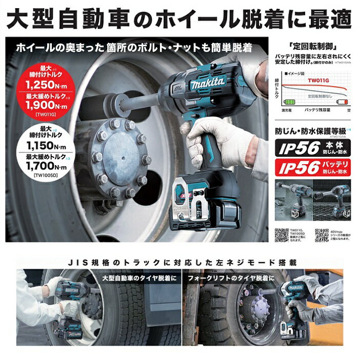 マキタ TW1005DZ+BL1860B+DC18WC 18Vインパクトレンチ 19mmsq 最大締付トルク1,150Nm ロングアンビル仕様 6.0Ahバッテリx1個+充電器付セット 大型自動車のタイヤ脱着に最適なロングアンビル仕様 新品