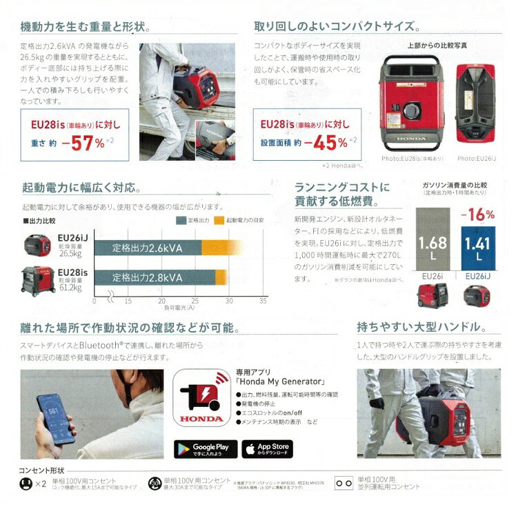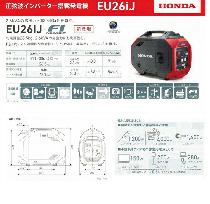 ホンダ EU26iJ 正弦波インバ-タ-搭載発電機 2.6kVAの高出力と高い機動性を両立 ハンディタイプ 並列運転機能付 新品 代引不可【プロ用からDIY、園芸まで。道具・工具のことならプロショップe-道具館におまかせ!】