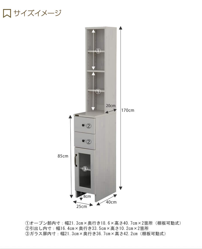 サイズ幅25cm×奥行き40cm×170cm【オープン部内寸】 幅21cm×奥行き18.6cm×高さ40.7cm×2箇所【引出し内寸】 幅16.4cm×奥行き33.5cm×高さ10.2cm×2箇所【ガラス扉内寸】 幅21.3×奥行き36.7×高さ42.2cm材質本体:プリント紙化粧繊維板、中段天板:合成樹脂化粧繊維板、扉ガラス部:4mm厚波ガラス脚部プリント紙化粧繊維板組立区分組立式お届け3〜4日営業日以内の発送予定となります。午前・午後のお届け時間のご指定が可能です。 備考【梱包サイズ】 93cm×43.5cm×18cm【商品重量】 約20kg【耐荷重】 天板:10kg、内部棚:5kg、引出し:7kg【付属品】 転倒防止金具【生産国】 ベトナム