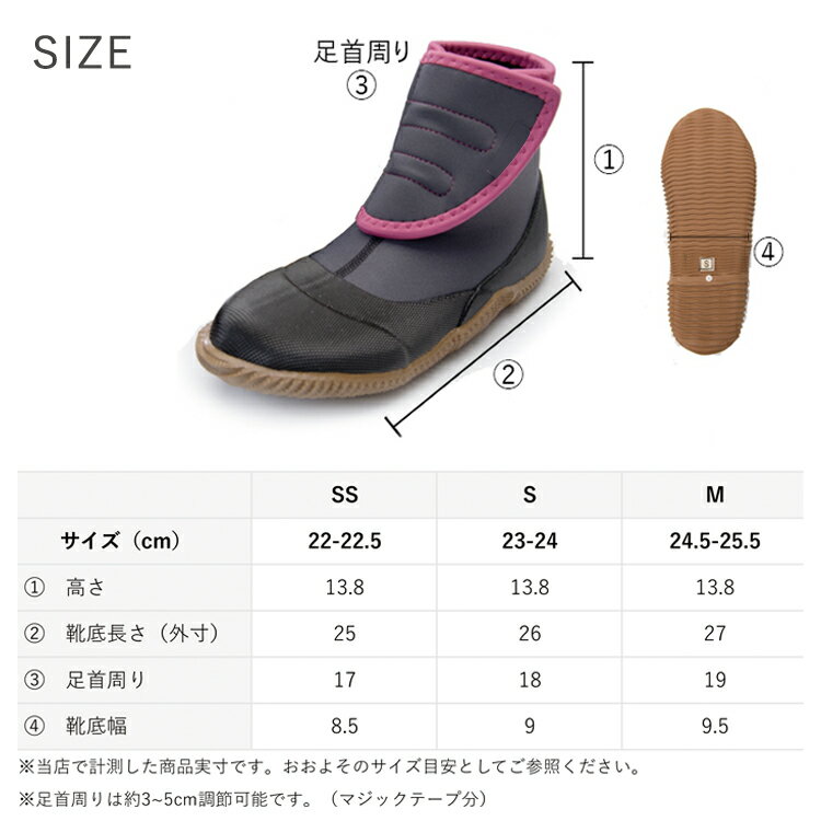 フィット感抜群、疲れにくい!新感覚のワークシューズ つま先が二重で丈夫なので、安心・安全! 農作業、園芸作業が楽になる! 長靴と比べるとスニーカーのようにフィットして 立ったりしゃがんだりしやすい! ウエットスーツのような素材のためとても丈夫で長持ち。 気兼ねなく靴が洗える! 【おすすめシーン!あらゆるワークシーンで活躍します】 ガーデニング/農作業/園芸/庭仕事/畑仕事/家庭菜園 酪農/牧場/畜産/花生産者/野菜作り/山歩き/散歩/レンタル農園 アウトドア/直売所/野菜販売/市民農園/公園/子供との外出 こどもとの農業体験/就農/登山/ハイキング/トレッキング ウォーキング/山登り/お買い物/旅行/農家/稲刈り/外作業 普段着/農作業の手伝い/農場/農業ブーツ/草取り/ また、農家さんや農業法人様でもスタッフユニフォームとしてご使用頂いております。 農業体験・収穫体験のお客様用にご用意しているところもあるんです。 暖かい心遣いに嬉しくなっちゃいますね。 20代・30代・40代の女性農家さん向けに作られたアイテムですが、 シンプルで落ちつたカラーなので年齢・性別問わず着用頂けます。 親子でお揃いで着用しても素敵ですね。 大型マジックテープで脱ぎ履き楽々♪ 足首でしっかり締めることができるので土、砂、草 などが入りにくく、ピッタリサイズで足が疲れにくいです♪ しっかりと締めてるのに足首も動かしやすく楽。 靴底がゴムなので滑りにくくなっています。 当店エフィルスで人気のモンクワ monkuwaのおしゃれ 農作業アイテムとコーディネートすると可愛いです! 【プレゼントとしてもおすすめ♪】 お誕生日プレゼント、母の日、敬老の日など園芸・ガーデニング ・家庭菜園が趣味の方へのギフトとして喜ばれております。 ◆ 仕様 ◆ カラー:グレーピンク サイズ:SS/S/M(レディースサイズ) SS:22〜22.5cm S:23〜24cm M:24.5〜25.5cm 品質 胴部:天然ゴム・合成ゴム 靴底:天然ゴム・合成ゴム 裏地:綿・ポリエステル混紡nomodo ノモドワークシューズ NMD502 女性農家さんのためにつくられたかわいいワークシューズ。やわらか素材で履き心地を追求☆ かわいいルックスと、動きやすさにこだわった新感覚のワークシューズ 農業や造園業で活躍する女性のために開発されたワークシューズ。 女性らしいかわいいデザインが目を惹きますが、機能性も抜群。 ハードな作業に耐えられるよう、履き心地・動きやすさをとことん追求した本格作業靴です。 地下足袋のように軽くしなやかな履き心地と、絶妙な丈感にとりこになる農家さん多数! ご家族のためにリピート注文されることも多い人気シューズです! スタッフ着用レビュー 普段24cmを着用、Мサイズで少しゆとりがあります。足首のマジックテープで調整できるので、 しっかりテープを閉じると足が泳ぐ感じもなくフィットしました。 底厚のスニーカー等と比べるとソール部分は薄めです。 そのため軽量で足の曲げ伸ばしをしやすいですが、アスファルトや屋内の作業場など固い地面で履くことが多い場合は、ワンサイズアップして厚めの中敷きを入れるのもおすすめです! 安全に、見た目もステキに着ていただきたいため、当店では交換も承っております。 他アイテムとのコーディネートをチェック! ≫ MONKUWA ダブルガーゼ アームカバー ≫ MONKUWA ダブルガーゼ チュニックシャツ ≫ GRACE ENGINEER'S オーバーオール ≫ MONKUWA デニムサロペット ●関連商品 クールなデザインがお好みなら、ネイビーとモスグリーンのベーシックカラーがおすすめ! ≫ メンズサイズはこちら ハイカットも人気です! ●ガーデニングファッション・シューズ一覧 ≫ ガーデニングファッション カテゴリトップへ戻る