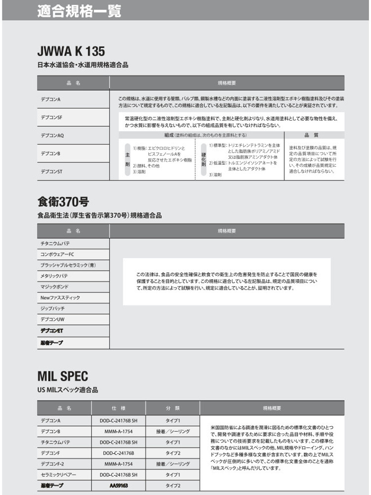 ■用途各種機械装置の亀裂、すの充填鋳鉄のす埋め等タンク接続部の漏れ止めパイプ、バルブ、フランジ、タンク接続部の漏れ止め金属の接着、防蝕用接着■特徴デブコンAQは鉄粉配合のエポキシ樹脂系補修剤で、デブコンAの4倍の速さで硬化する速硬化タイプであり、特に緊急を要する箇所の補修に使えます。 用途としてはデブコンAと同じであり、各種金属、その他の母材に対し強力な接着をします。 ●鉄粉配合●デブコンAの4倍の速さで硬化する速効果タイプ●金属全般、木材、コンクリート、石材に対し接着力が強い●異種金属の補修や接着を行っても電蝕を起こさない●硬化後は各種ハンド&機械加工が可能●貯蔵安定性に優れ、長期保存が可能●鉱物油、ガソリン、水に対して優秀な耐性を有する■性能可使時間: 7〜8分/25℃ 塗膜硬化時間: 4時間/25℃ 色調: 灰色 混合比: 7:1(重量比)/5:2(容積比) 比重: 2.3 外観: パテ状 耐熱温度: 100℃ 入り目: 0.5kgセット※6個入りのケースでの販売もしております。■商品名 デブコン AQ (プラスチック スチール パテ) 0.5kg×6個セット 【あす楽】■デブコン選定表使用環境条件製品名容量金属全般、コンクリート、石材、ガラス、木材用補修剤一般補修(穴埋め、水漏れ、油漏れ等)接着固定使用環境温度90〜120℃デブコンA(鉄粉、パテ)0.45kg/1ポンド1.81kg/4ポンド11.25kg/25ポンドデブコンAQ(鉄粉、パテ、速硬化:4時間)0.5kgデブコンSF(鉄粉、パテ、速硬化:1時間)0.45kg/1ポンドデブコンB(鉄粉、液状)0.45kg/1ポンド1.81kg/4ポンド11.25kg/25ポンドデブコンF(アルミ粉、パテ)0.45kg/1ポンド1.36kg/3ポンドデブコンF-2(アルミ粉、液状)0.45kg/1ポンドデブコンWR(アルミナ粉、液状、耐摩耗)0.5kgデブコンWR-2(アルミナ粉、パテ、耐摩耗)0.45kg/1ポンドデブコンAW(アルミナ粉、パテ、耐摩耗)9kg/20ポンドデブコンST(ステンレス粉、パテ)0.45kg/1ポンドデブコンBR(ブロンズ粉、パテ)0.45kg/1ポンドデブコンUW(パテ、水中硬化)0.45kg/1ポンド使用環境温度120〜250℃HR-300(鉄粉、パテ)0.5kg1kgHR-303(アルミ粉、パテ)0.5kgメタリックパテ(アルミ、パテ、光沢精密)0.2kg使用環境温度250〜300℃HRスーパー3000(鉄粉、パテ、速硬化:4時間)0.5kg