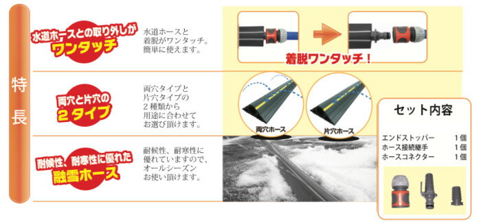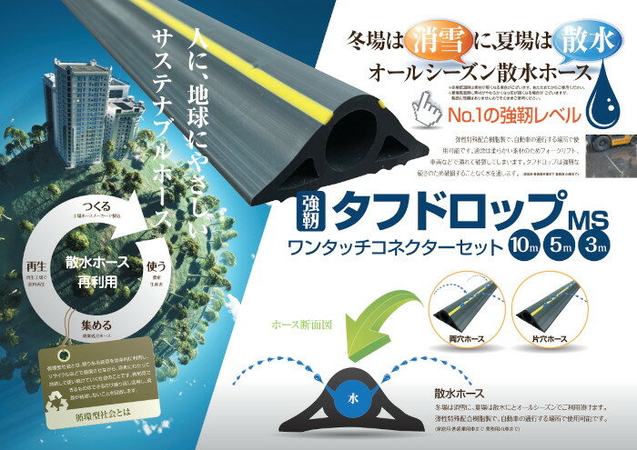 ※画像はイメージです。※本商品はメーカー取り寄せ商品です。※掲載商品は予告無く販売終了となっている場合があり、出荷確約をするものではありません。■特長●弾性特殊配合樹脂製で強靭な硬さのため、自動車の通行する場所で破損することなく使用可能です。(家庭用 普通乗用車まで/業務用 4t車まで)●冬は融雪・消雪に、夏は散水に大活躍のホースです。(オールシーズン使えます!)●着脱に便利なコネクターがセットになっています。●両穴タイプ(ホースの両側面に散水)と片穴タイプ(ホースの片側側面に散水)の2種類からお選びいただけます。●屋外での使用を想定しておりますので、耐候性・耐寒性に優れています。■用途●自動車の通行する場所で●冬は融雪・消雪に、夏は散水に■セット内容●強靭タフドロップMS 10m 1本●ワンタッチコネクターセット(エンドストッパー1個、ホース接続接手1個、ホースコネクター1個)■注意事項●冬場の低温時には素材が硬くなる場合があります。(あたためてからご使用ください)●夏場の高温時には素材が柔らかくなり、圧が弱くなる場合がありますが、製品に問題はありません。